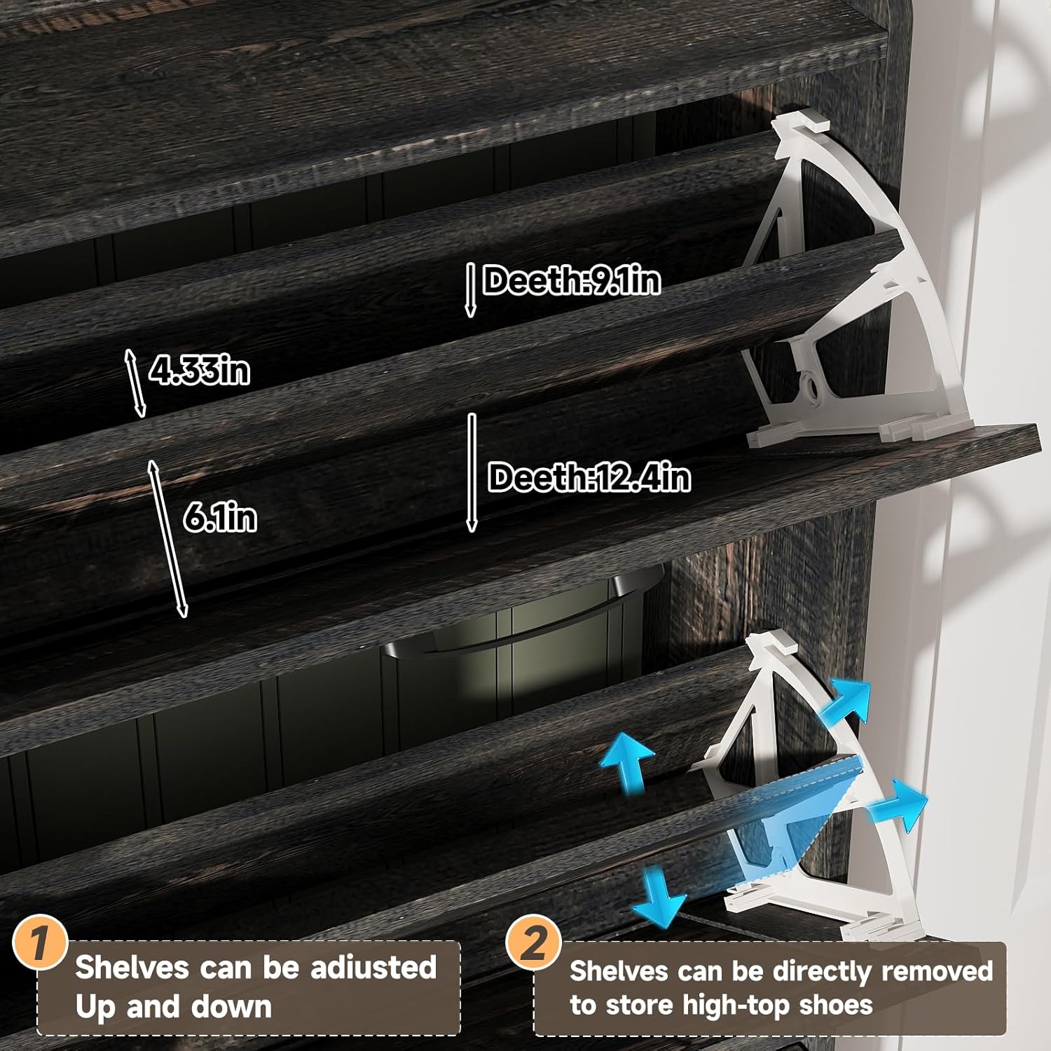 - Narrow Shoe Cabinet: Most other shoe cabinets have a depth of 14-15in, while our slim shoe cabinet depth front to back is 9.35in! Only half the volume of other shoe cabinets, but it can neatly hide and store more and larger shoes! Innovative flip space-saving design, bringing more space in the entry area or hallway
