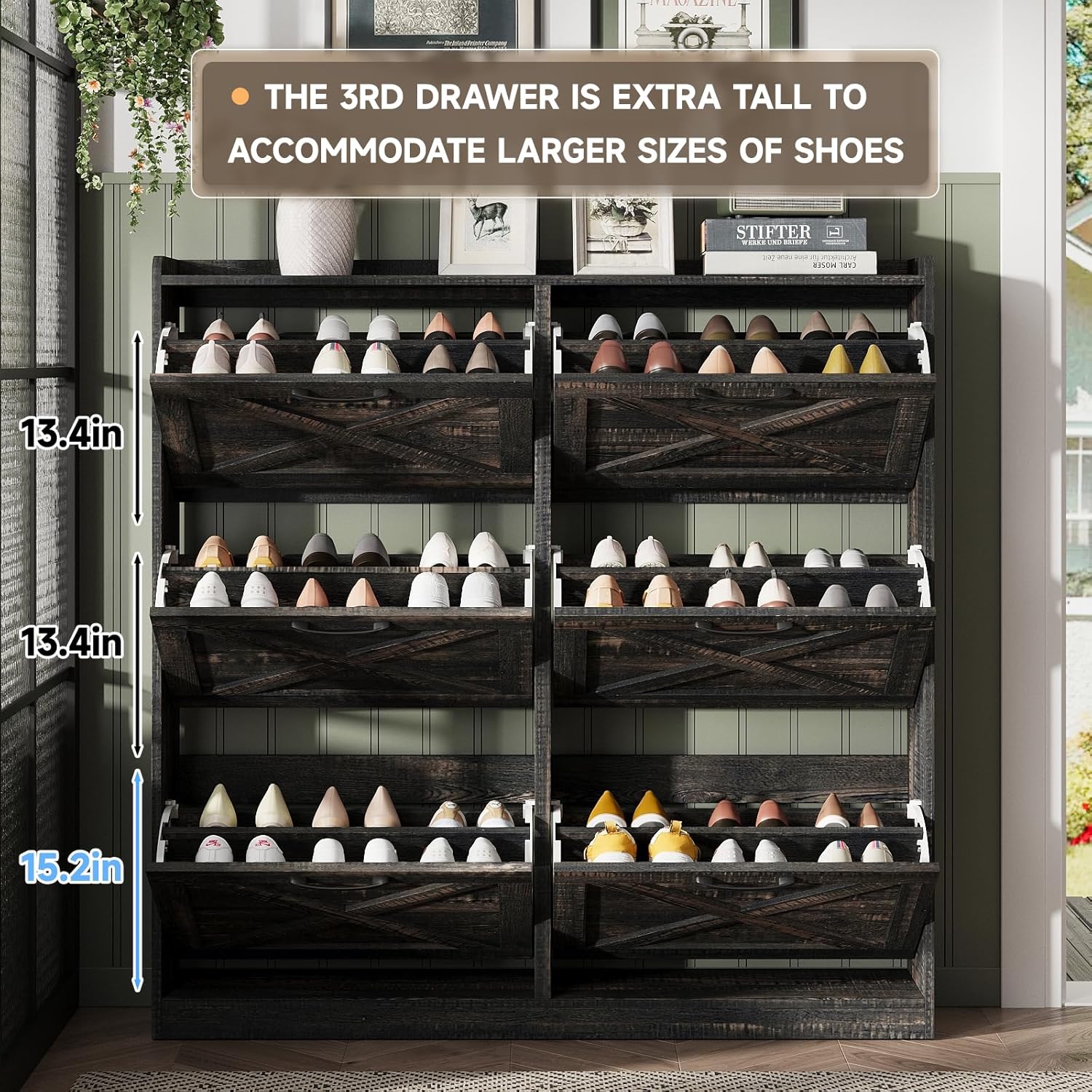 - Large Capacity Shoe Cabinet: The drawer shoe cabinet can store up to 36-48 pairs. There are 6 upper and lower drawers, each drawer contains two layers of storage space. The panel can be adjusted or removed in two grooves to accommodate different heights and sizes of flats, mid boots or heels! There is a fence on the top, ideal for placing potted plants, ornaments, socks and keys, without worrying about falling