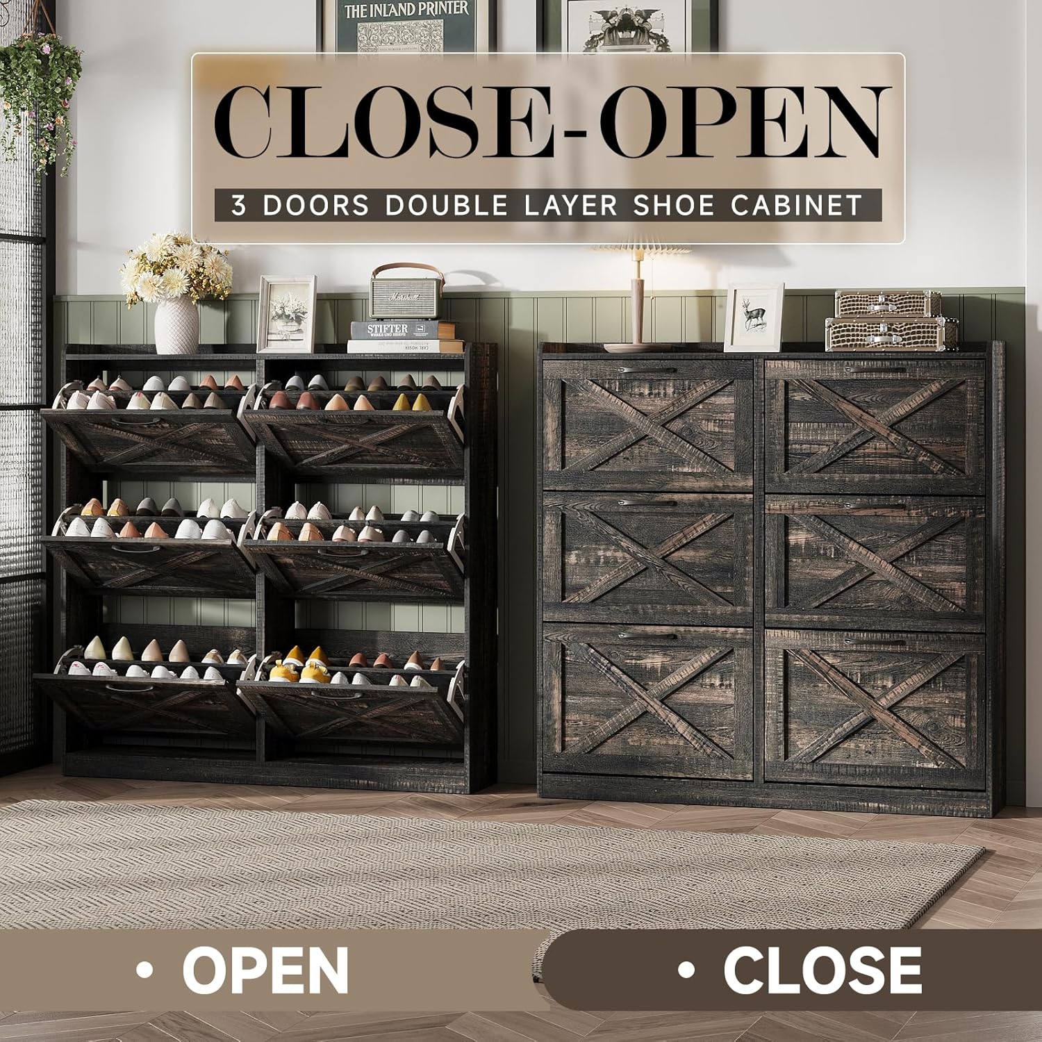 - Entryway Shoe Cabinet: The hidden shoe storage cabinet with 6 flip doors, stylish and simple dark rustic oak makes it a neat and beautiful finish and looks great in many different home styles. Perfect for placing in the entryway, hallway, living room, or porch, provides a neat looking in your home and space saving