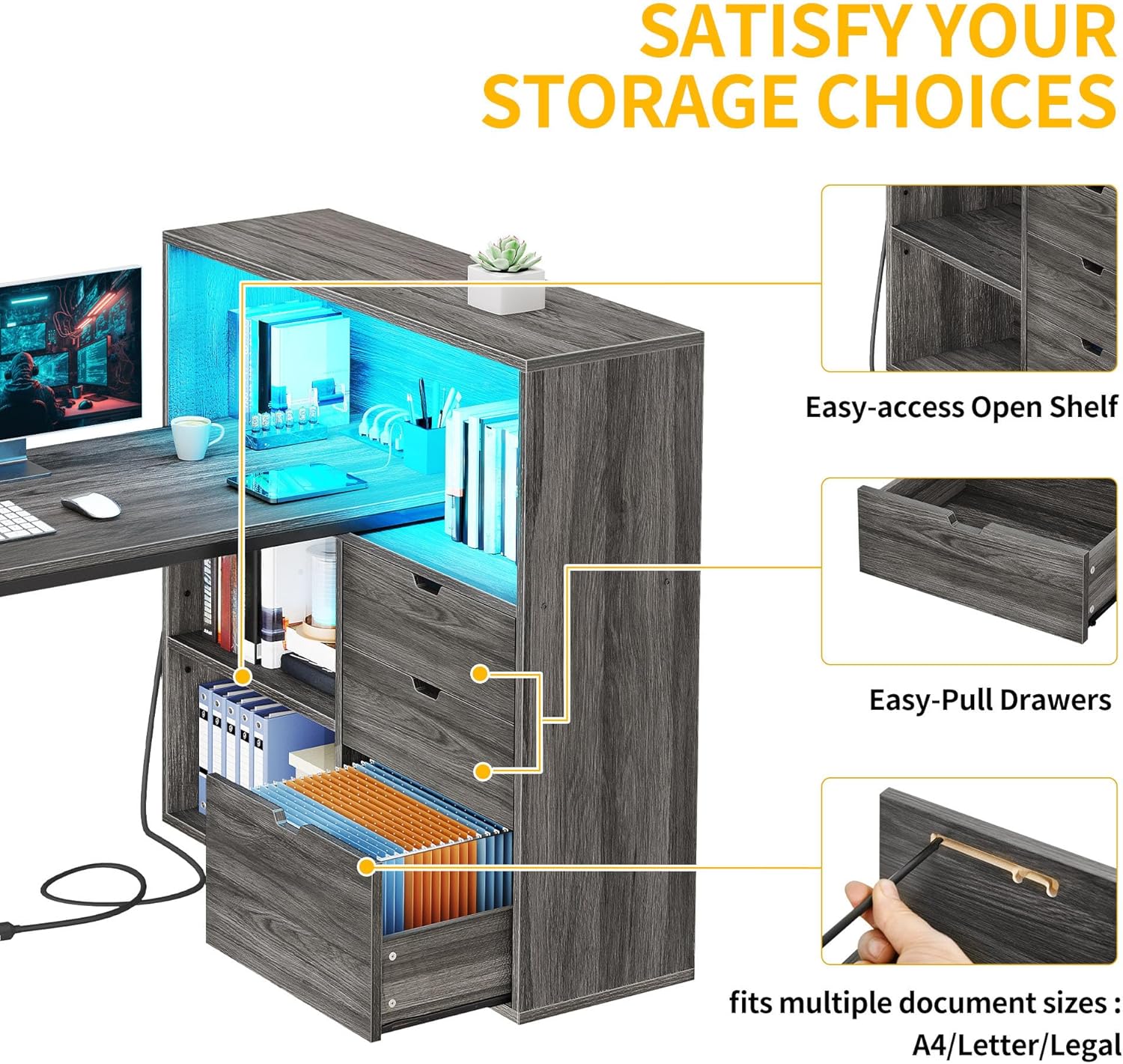 DWVO L Shaped Desk with Drawers, 55" Corner Computer Desk with Bookshelf & Power Outlets & LED Lights, Home Office Desk with Storage Shelves, Grey