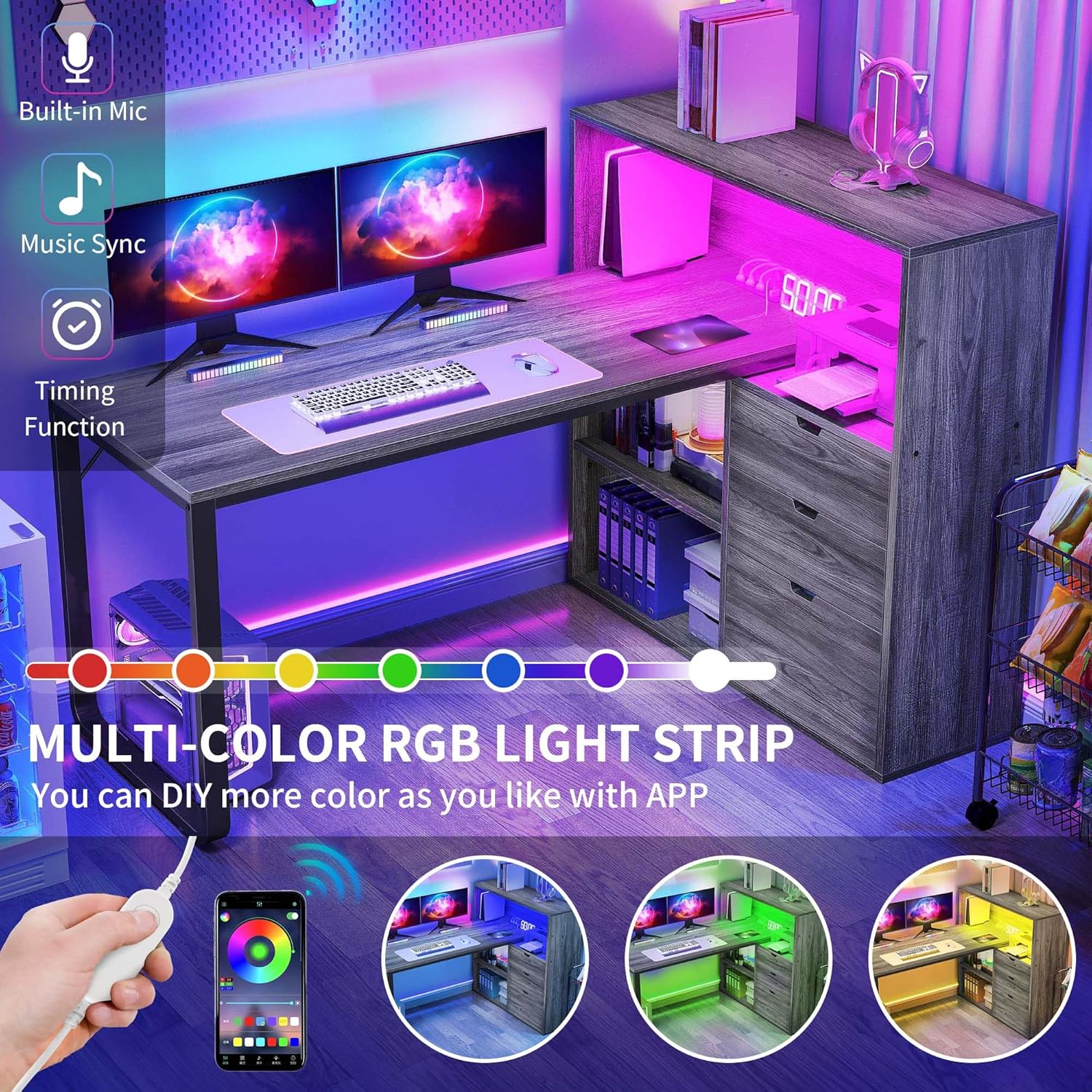 - Smart LED Light Strips: Our L-shaped desk features a beautiful RGB LED light strip, flexibly controlled by a phone app or light strip switch, and you can customize any color you like via app. Plus, choose from various modes including music sync and timer functions to enhance the mood and inspire creativity while working