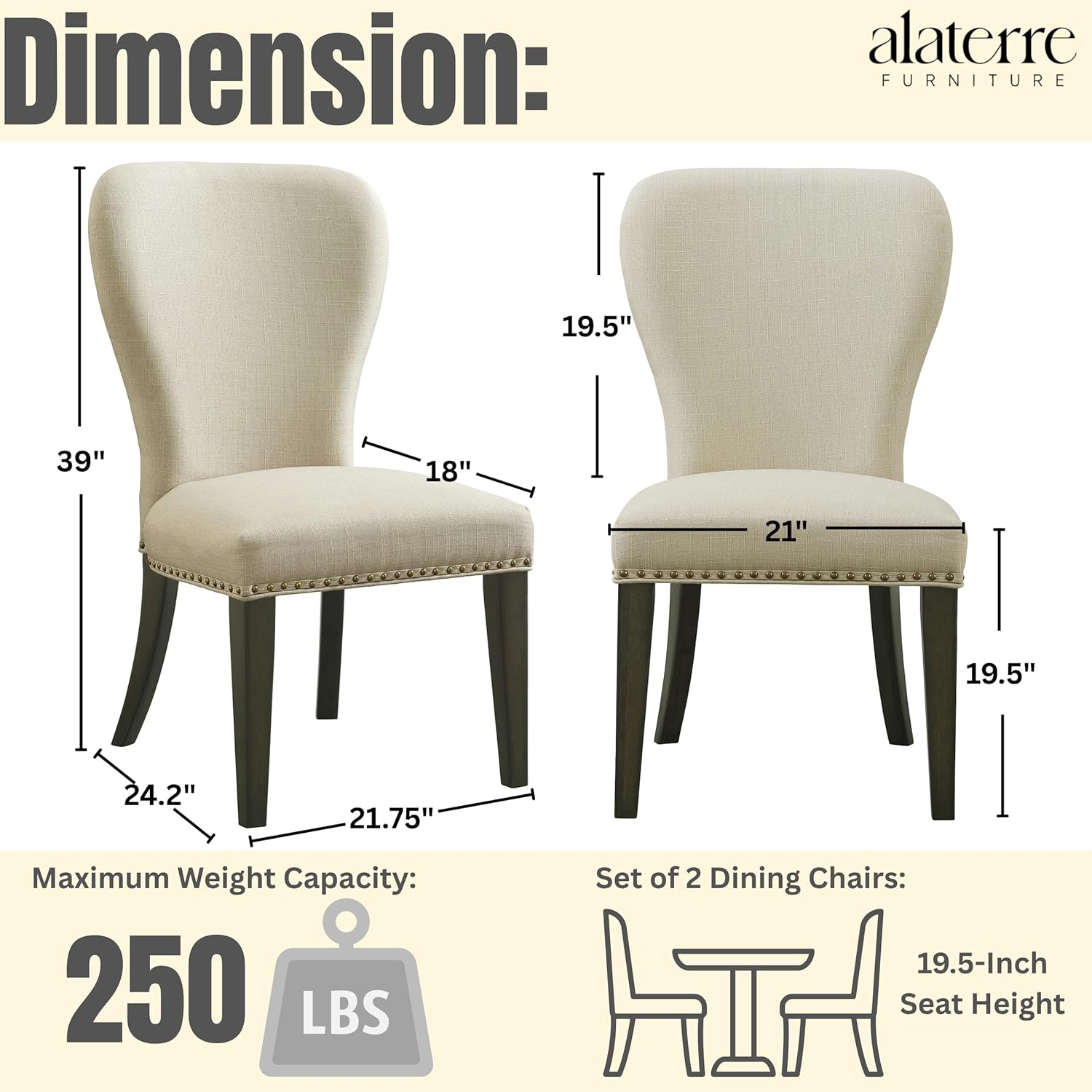 - PRODUCT DETAILS – Materials: Rubberwood, Polyurethane Foam, Polyester Fabric. Overall Dimension: (L) 21.75" x (W) 24.2" x (H) 39", Seat: (L) 21" x (W) 18" x (H) 19.5". Weight Capacity: 250lbs. Set of 2. Color: Cream.