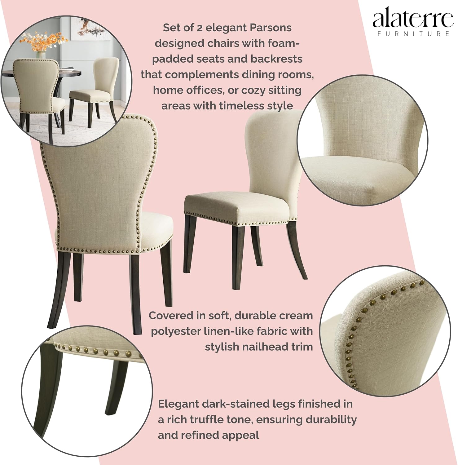 Alaterre Furniture Savoy Upholstered Dining Chairs – Set of 2 Parsons Style Accent Chairs with Cream Linen Fabric, Nailhead Trim, and Dark Stained Legs – for Dining Room, Desk, or Sitting Area