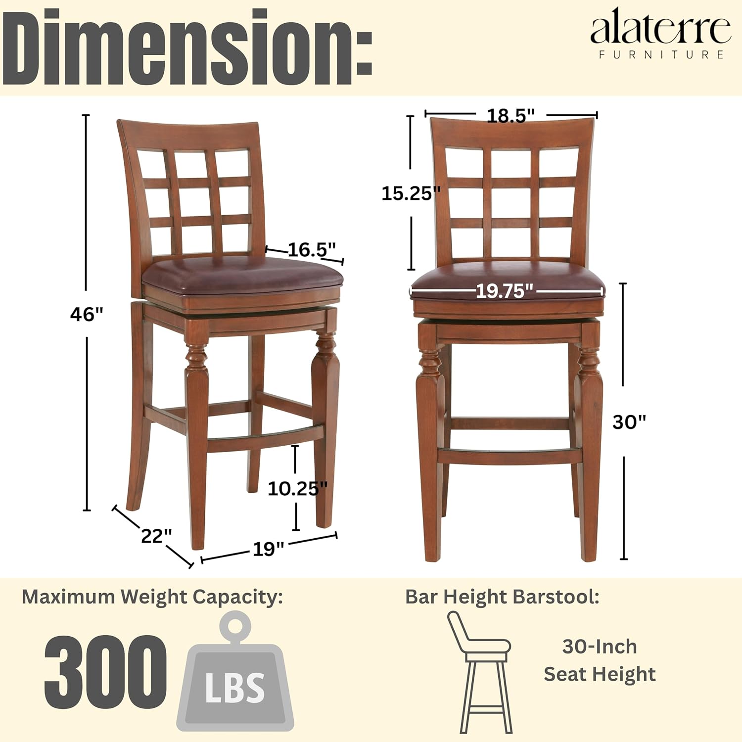 Alaterre Furniture Napa Bar Height Swivel Stool with Back – Faux Leather Upholstered Seat Barstool with Memory Return, Turned Wood Legs, Lattice Back Design, and Metal Kick Plate for Kitchen Islands