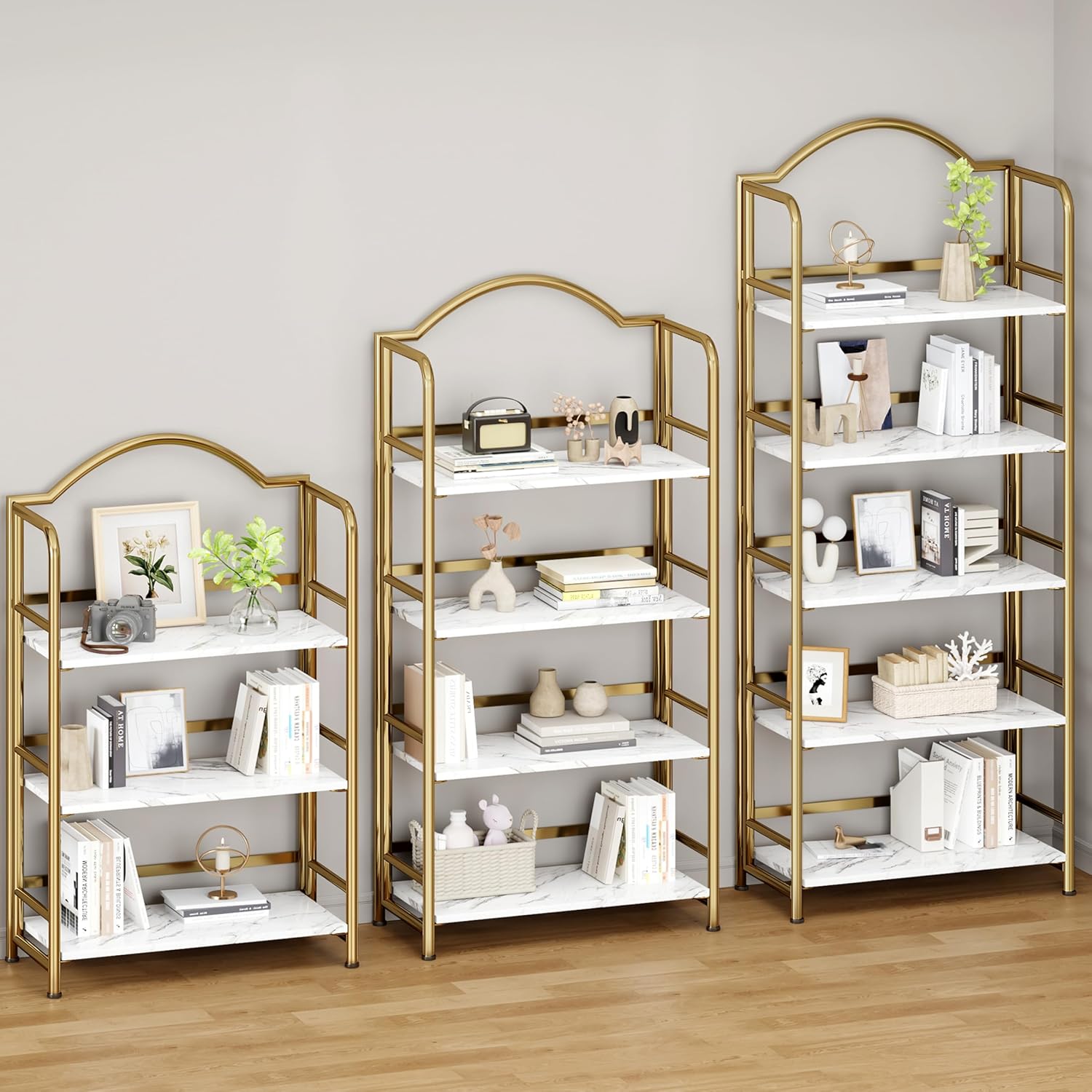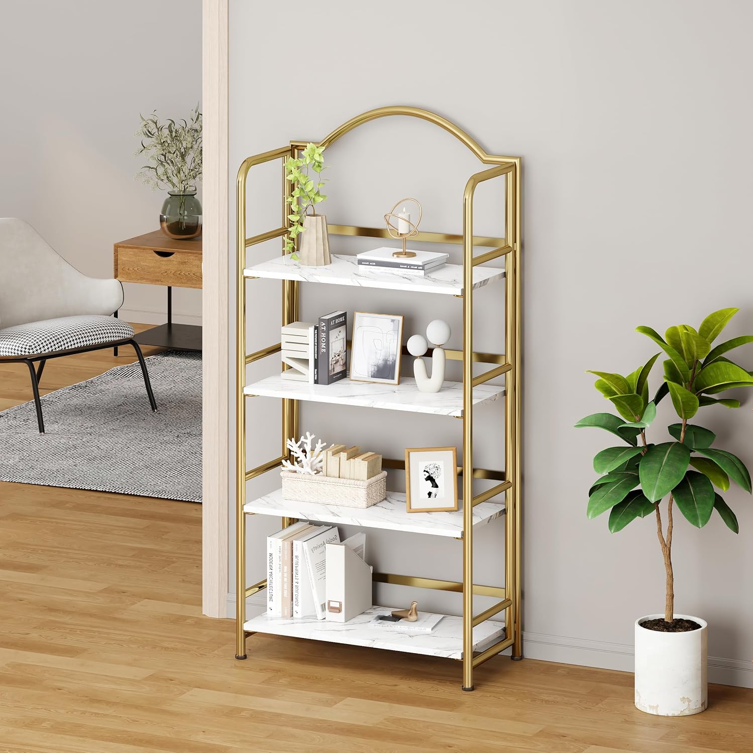 No-Assembly Gold Folding Bookshelf Storage Shelves 4 Tiers Vintage Multifunctional Plant Flower Stand Storage Rack Shelves Bookcase for Home Office