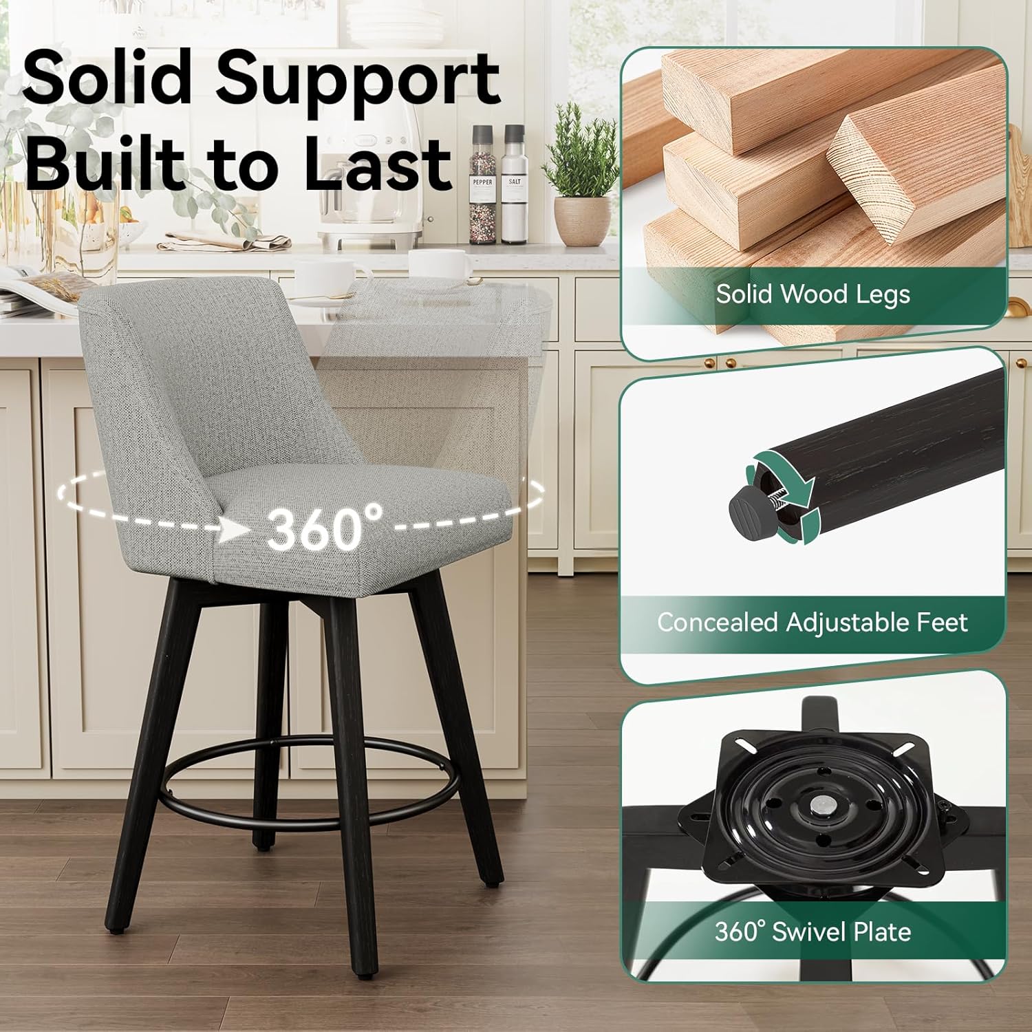 Vipbear Swivel Counter Height Bar Stools Set of 2,26.8" H Counter Stools with Back, Mid Century Modern Bar Stools for Kitchen Island,Linen Fabric,Wooden Base, Light Gray