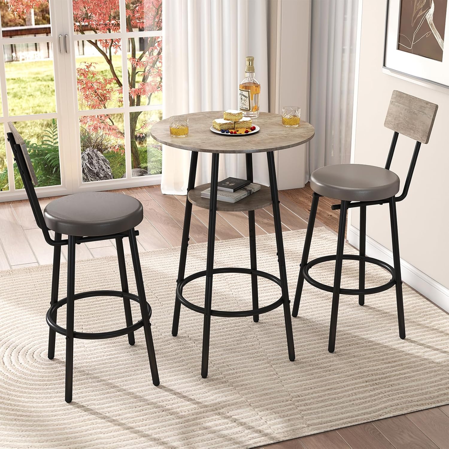 - 【Pub Table and Chairs Set of 2】Our retro-style 3-piece set includes 1 round table and 2 matching stools. The table features a 13.2" wide circular shelf in the center, suit for storing wine glasses, lighters, bottle openers, and more. Ideal for family meals, social gatherings, or bistro spaces.