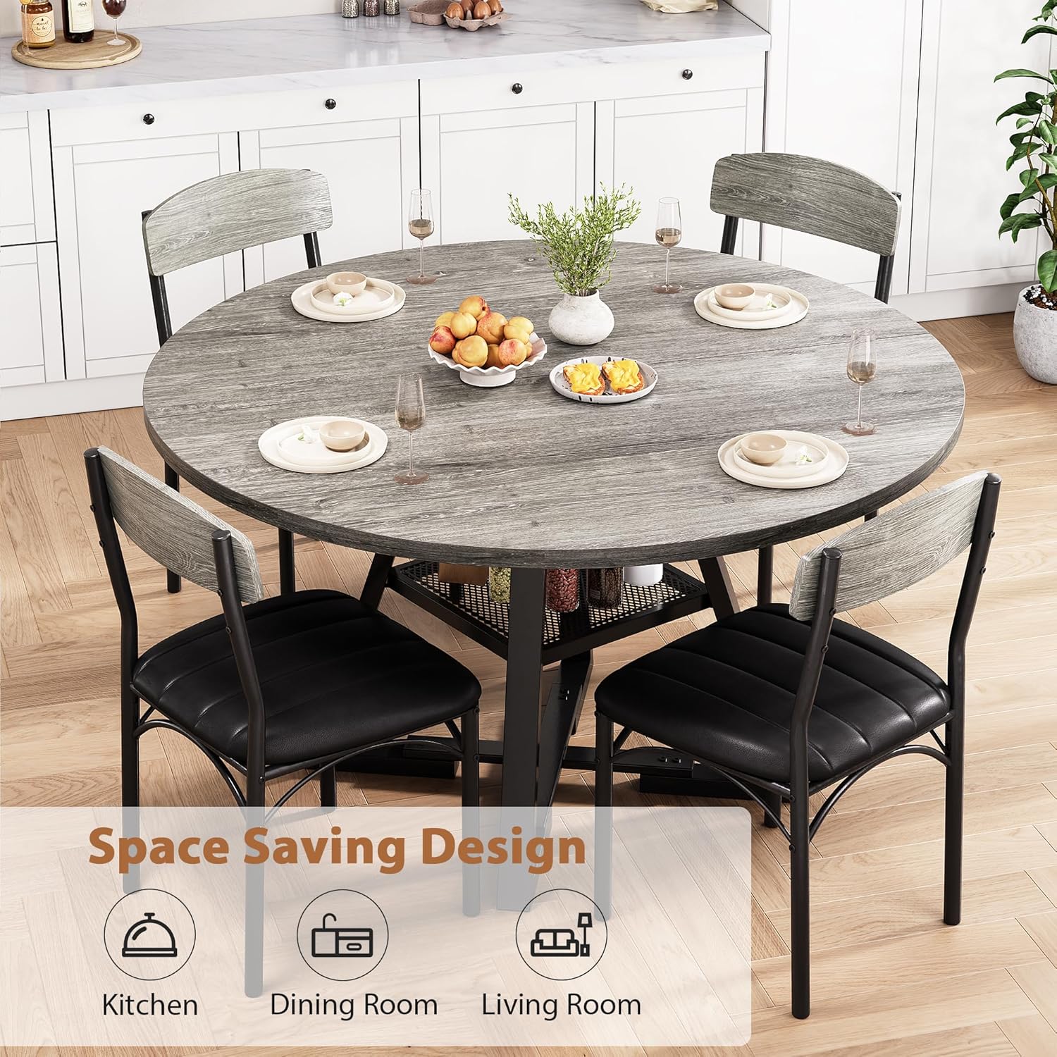 - EXTRA LARGE STORAGE SPACE: A Thoughtfully designed storage shelf is for organizing tableware and kitchen essentials, keeping them easily within reach. It helps maintain a clean, tabletop while providing convenient access to everything you need. Round dining table maximizes the usable area of the dining table, a 47-inch round dining table set for 4, ideal for family meals and gatherings.