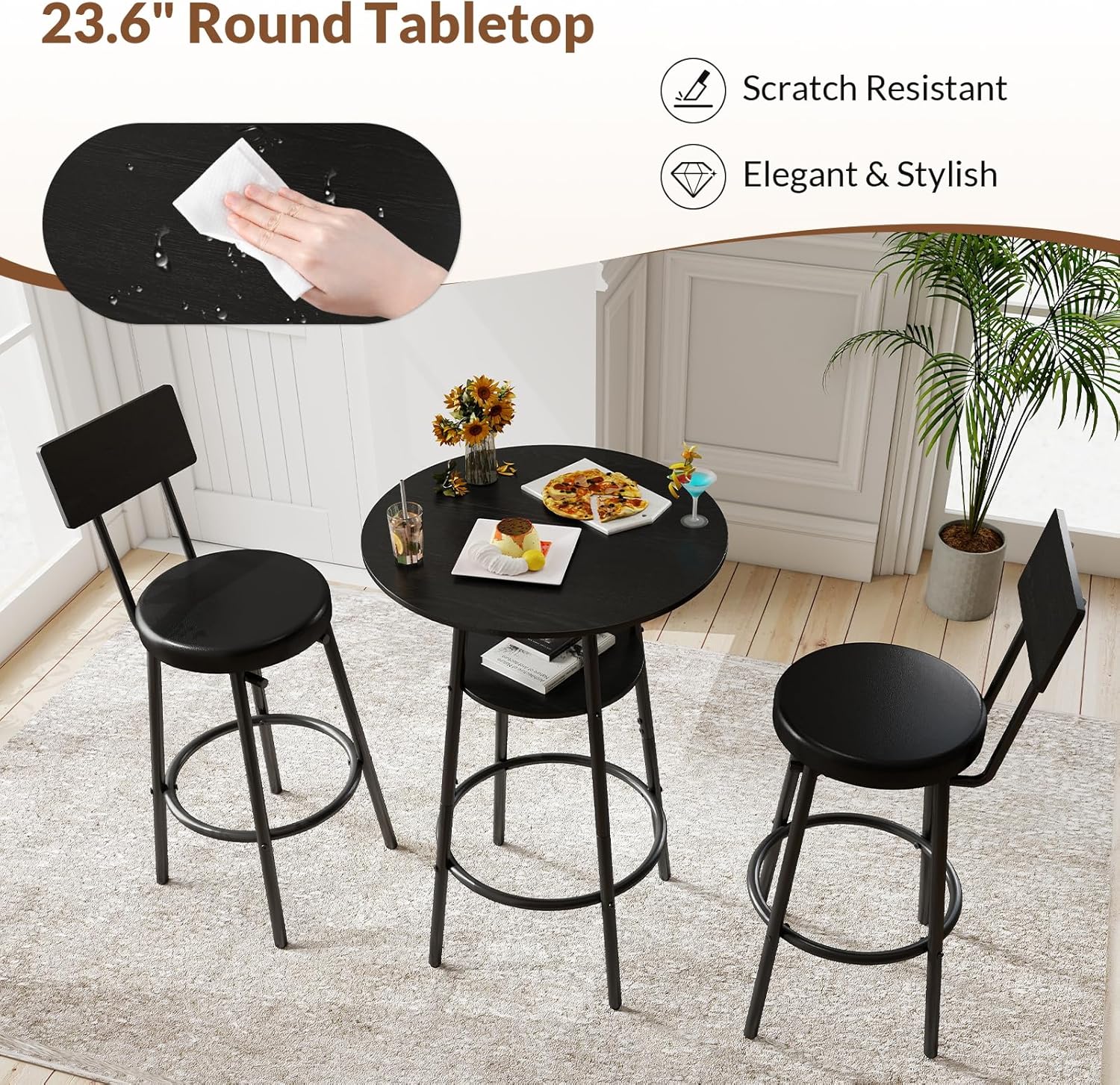 3 Pieces Round Bar Table Set, Small Dining Table for 2, Black Kitchen Bar Table, Breakfast Table with Storage, 2 Thickened Cushion Stools with Backrest for Dining Room & Bistro-Black