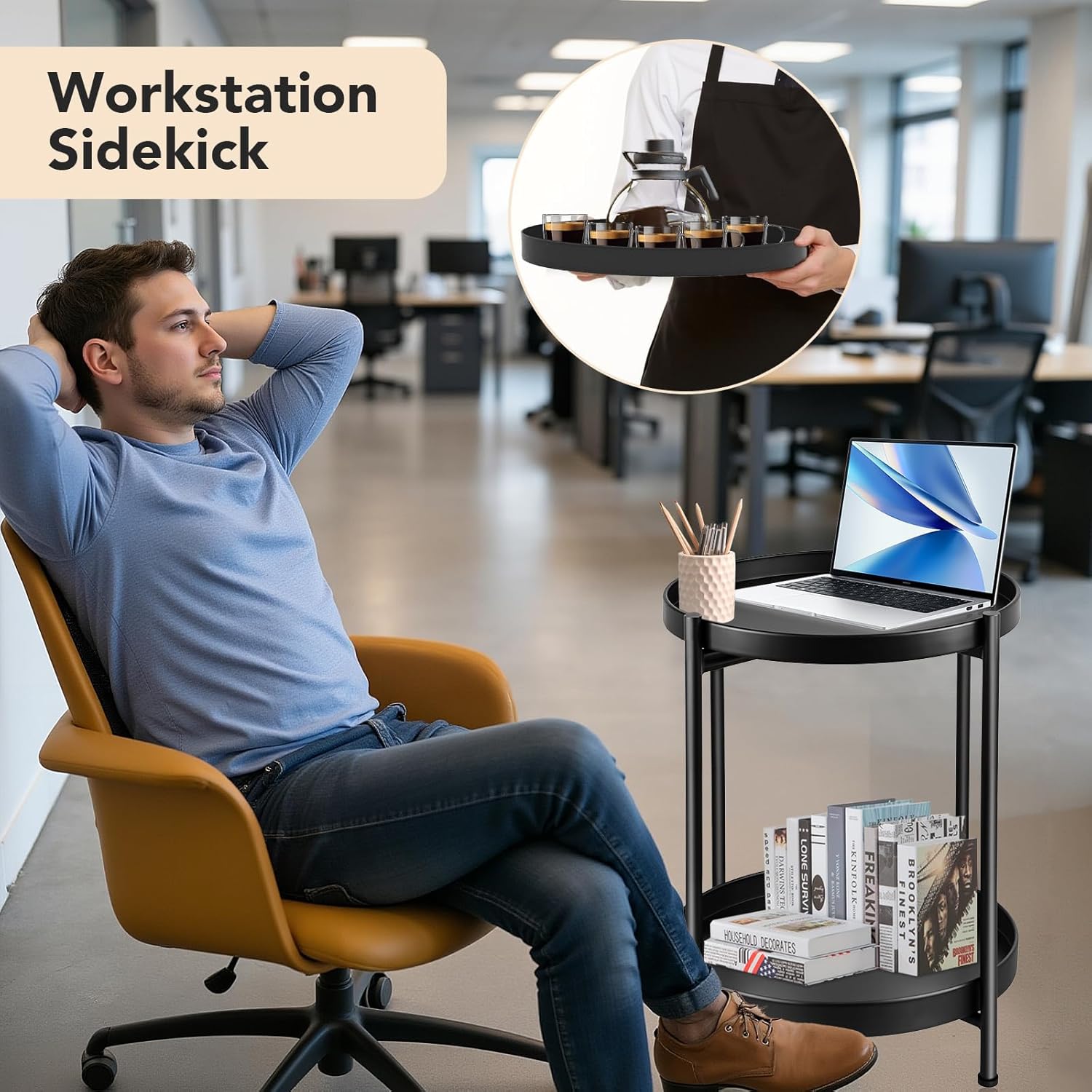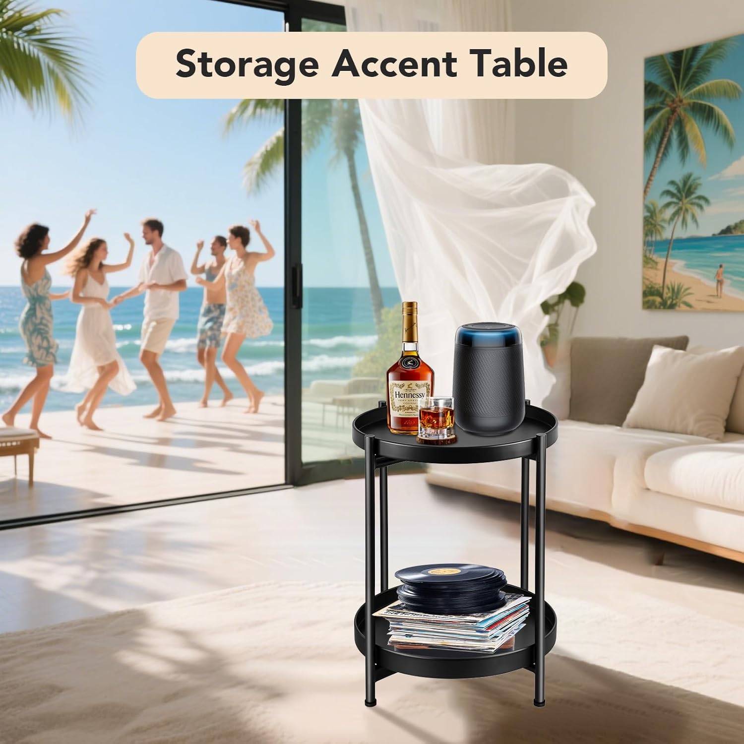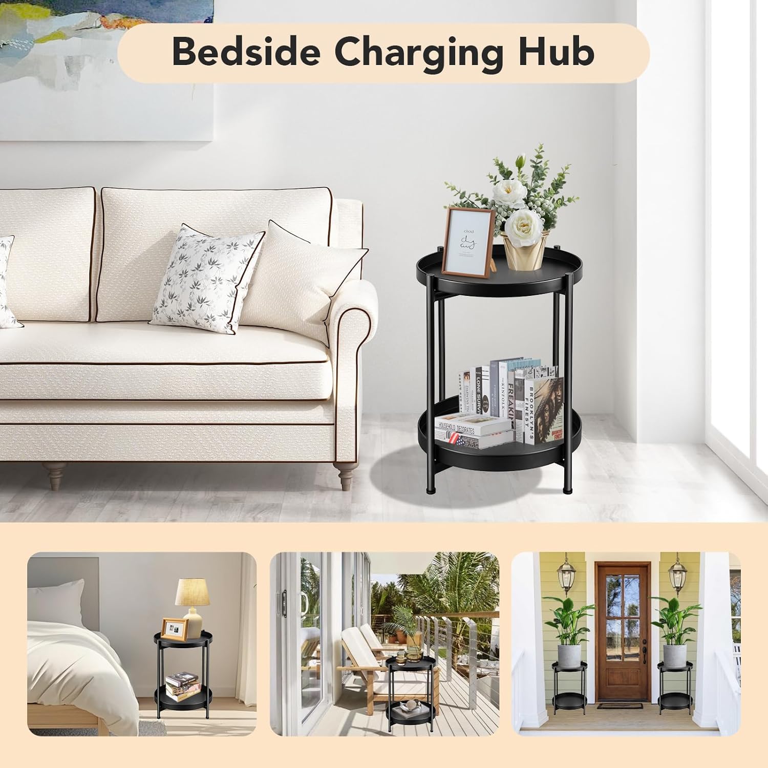 - Upgrade your space with this sleek metal two-tier round side table! Perfect as a bedside table,couch side table, or small patio table. The anti-fingerprint matte black finish resists stains&scratches while adding modern flair to any room or outdoor setting.