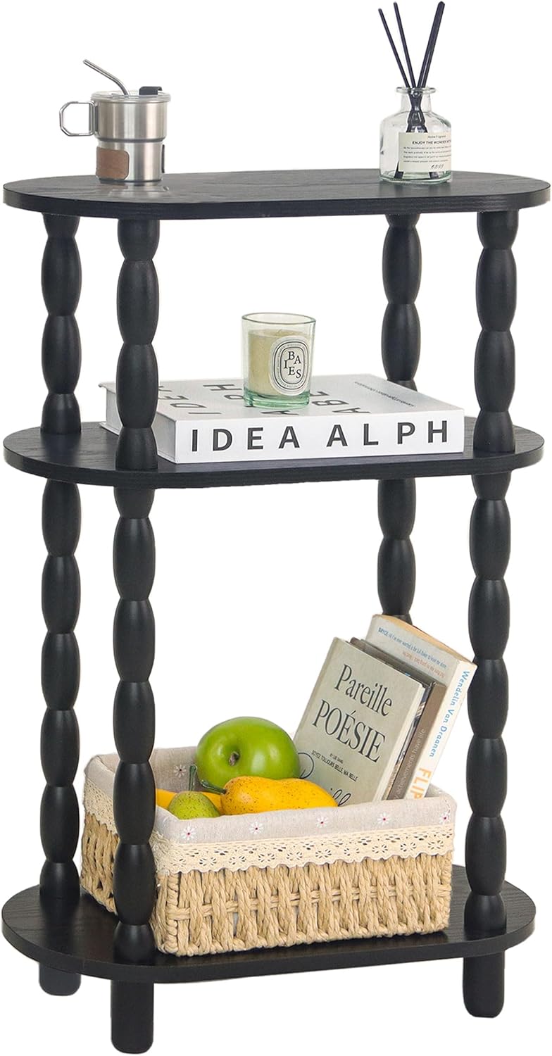 - 3-Tier Side Table: Featuring three open shelves for optimal organization, this small end table’s top tier holds lamps or drinks, while the middle and lower tiers store books, remotes, and essentials. The airy design keeps items neatly displayed and easily accessible