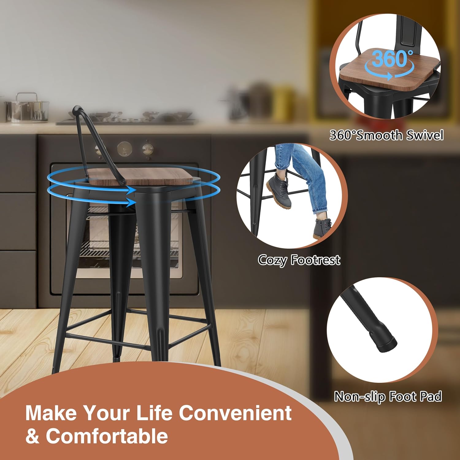 - ă360-Degree Swivel Seat.ăThis swivel bar stool is easily switch directions. Have a pleasant chatting with your family during dining