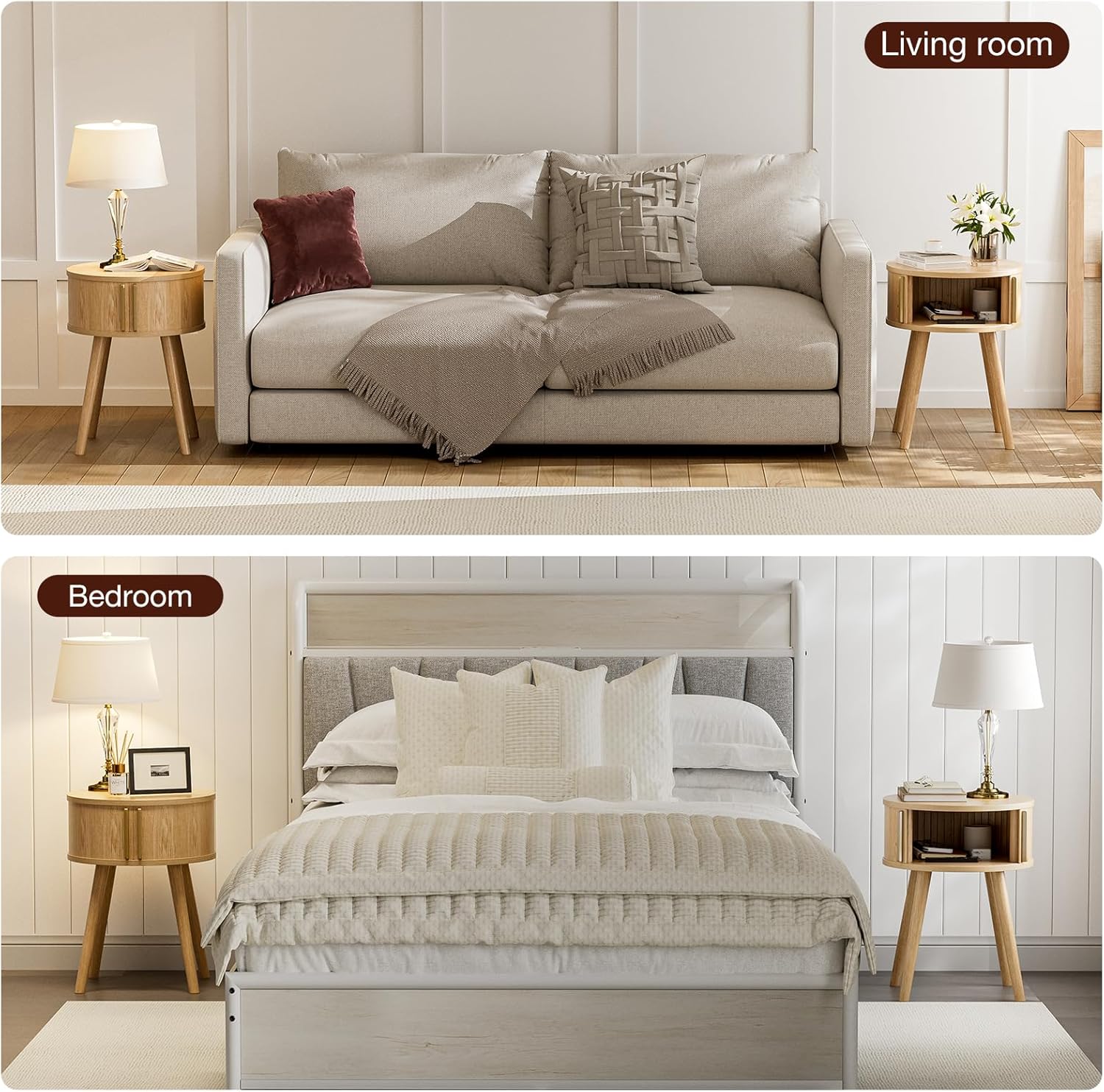Side Table with Sliding Door & Cabinet, End Table for Living Room, Night Stand for Bedroom, Modern Bedside Table with Solid Wood Legs, Natural