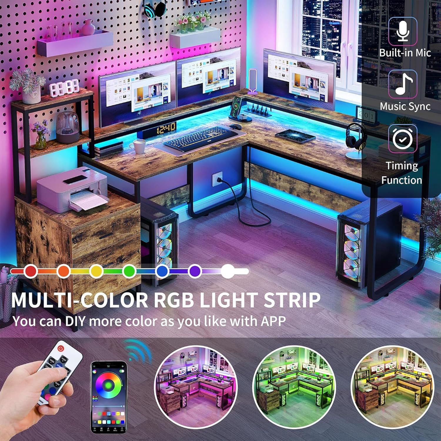 - LED Light Strips: Our L-shaped desk features a beautiful multi-colour RGB LED light strip, flexibly controlled through your phone app or remote control. Customize any color and choose from various modes like music sync, built-in Mic and timer functions via app to enhance the mood and inspire creativity while working