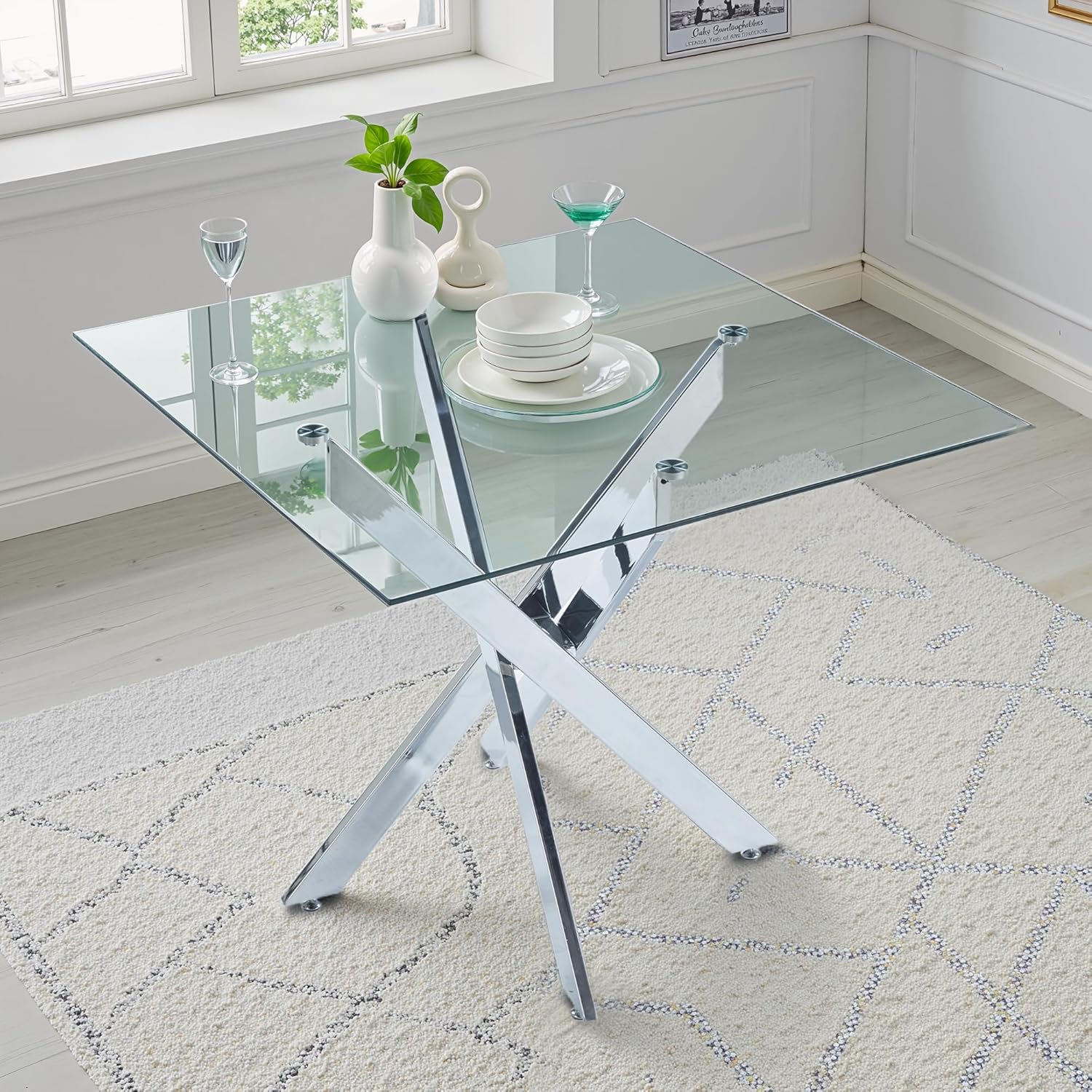 Dining Table for 4 Modern 35.43" Rectangular Glass Dining Table Kitchen & Dining Room Tables with Metal Base for Dining Room and Apartment, Chrome