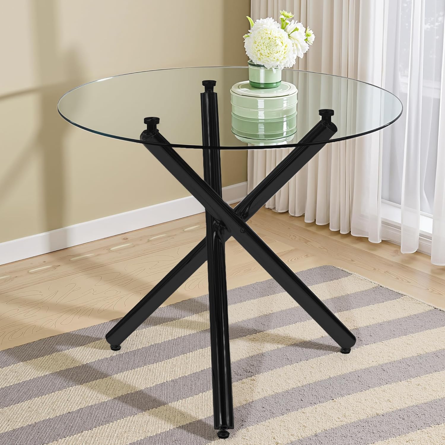 - Generous Round Tabletop: Featuring a spacious round tabletop, this piece offers ample room for family dinners, game nights, or decorative displays. The smooth glass surface provides a sleek backdrop for meals, while the rounded edges add a modern touch.