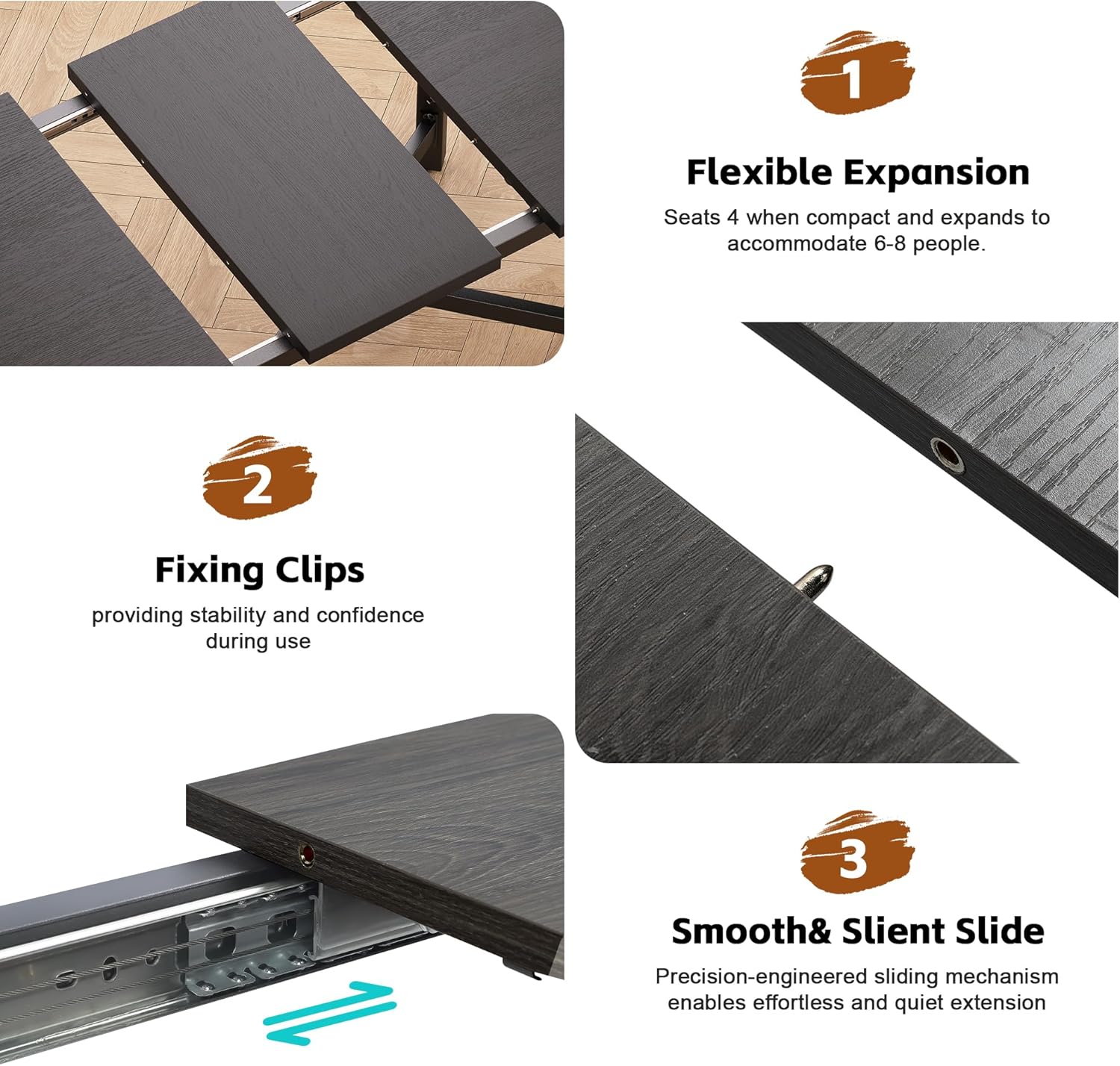 - 62" EXTENDABLE DINING TABLE:(Package Includes one Table) This extendable dining table features smooth, silent rails for quick and effortless extension. When not extended, the table measures 47 inches, and it can be extended to 63 inches by adding independent extension boards in the center. The extension leaves can be conveniently stored under the tabletop, saving valuable space. Perfect for small apartments, dining rooms, kitchens, and against-the-wall setups, making it an ideal choice for family gatherings.