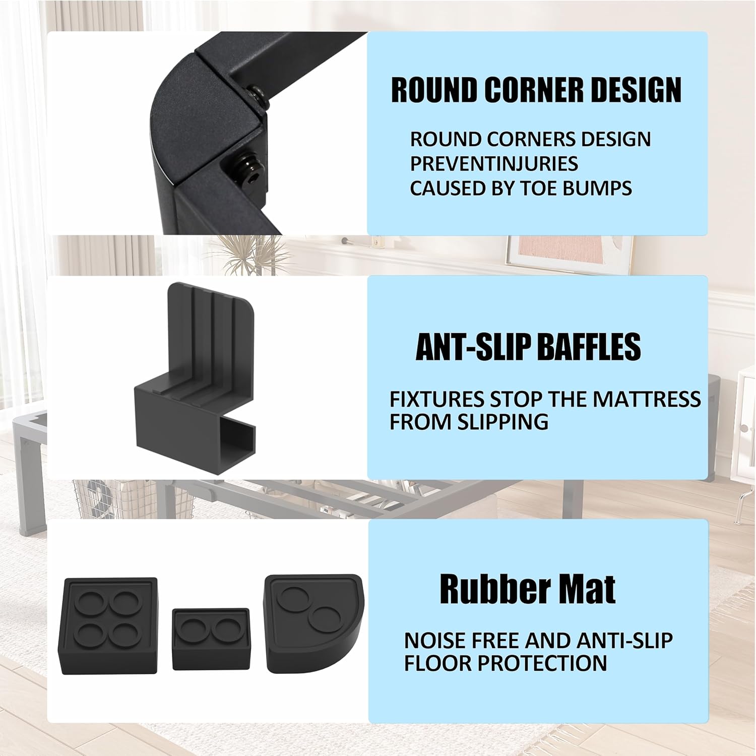 - Special Feature : No Box Spring Needed, Headboard Hole Leg and Rounded Corner, Anti-slip and Noise-free Rubber Pads