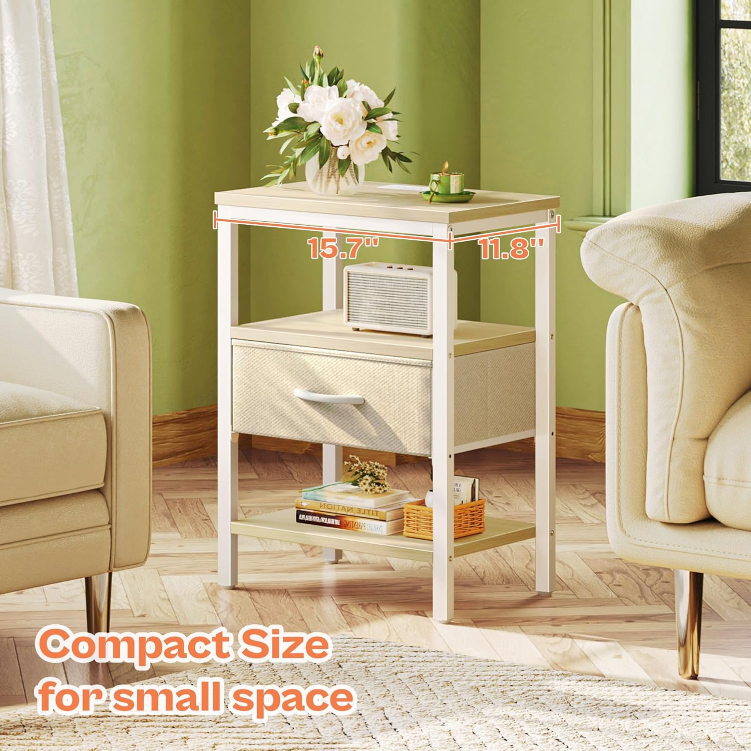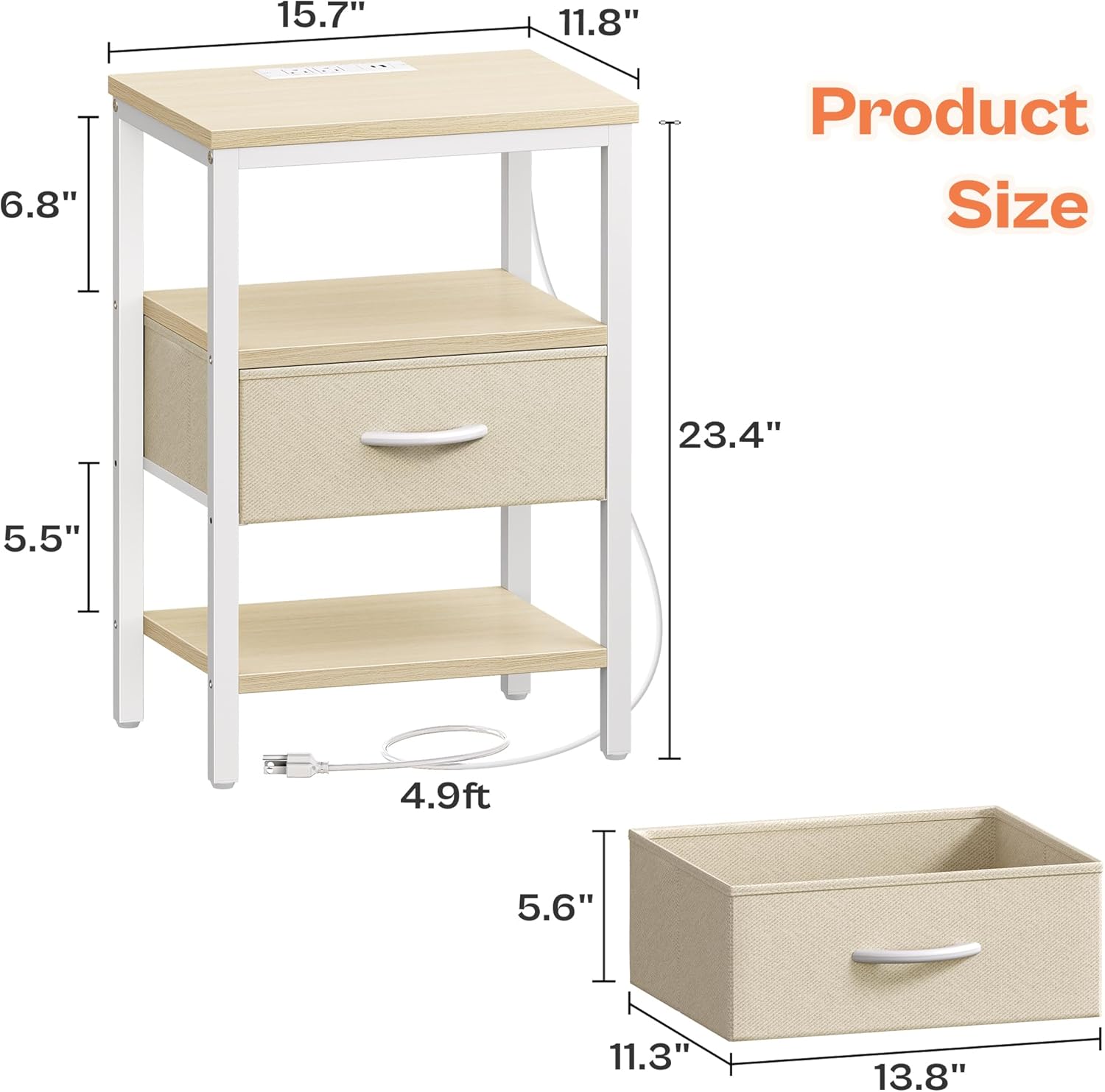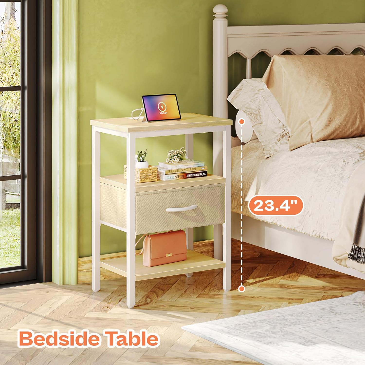 SUPERJARE Nightstand with Charging Station, Bed Side Table with Adjustable Fabric Drawer, Night Stand for Bedroom, 3-Tier Storage End Table, for Living Room, White Maple
