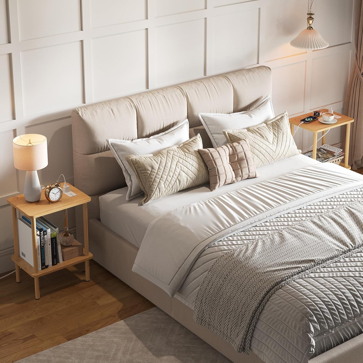Apicizon 2 Tier End Table, Small Side Table with Charging Station, Boho Bedside Table with USB Ports and Outlets, Nightstand for Small Spaces, Bedroom, Living Room, Entryway, Easy Assembly, Natural