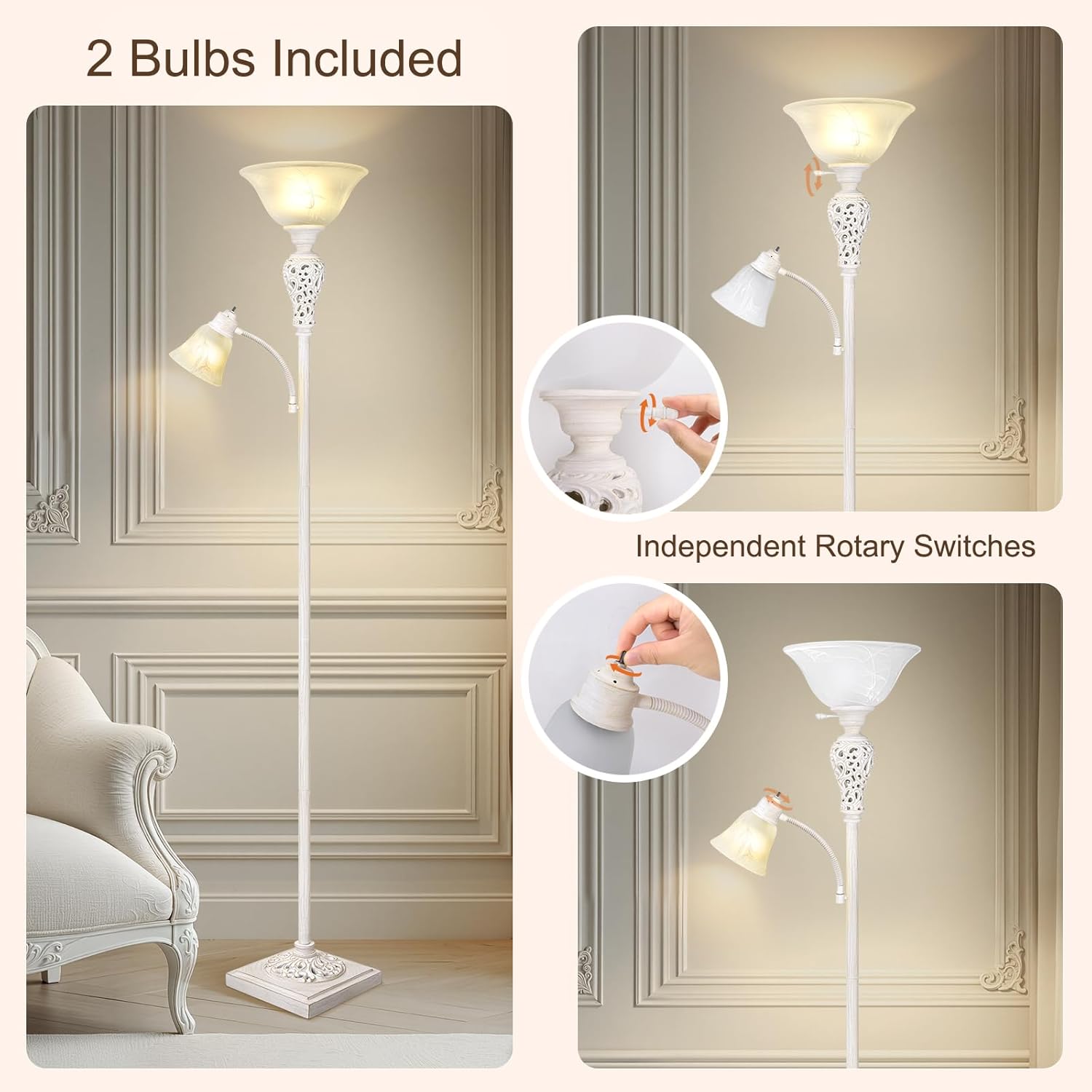 - Unique Design: The torchiere lamp features 2 white alabaster glass shades with a frosted texture, which looks more elegant and softens the light. The hollow carved leaves design and washed white finish of the lamp body add a vintage touch to your home.