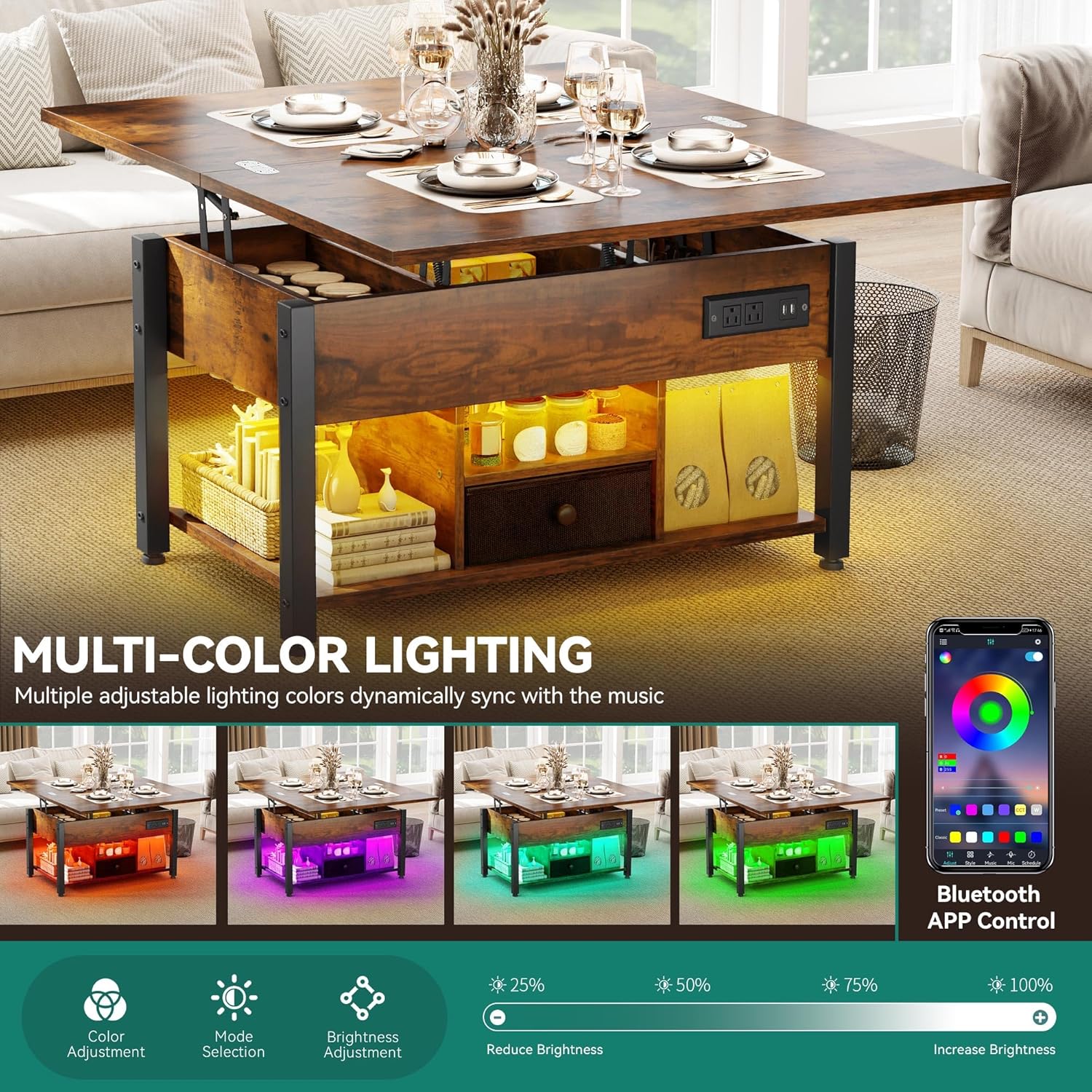 - 4-in-1 Smart Transformer: Instantly switch this lift-top coffee table into a workspace, 8-seat dining table, or gaming hub with storage; The dual gas-lift system offers stable support, while its semi-open design flexibly adapts to your surface needs