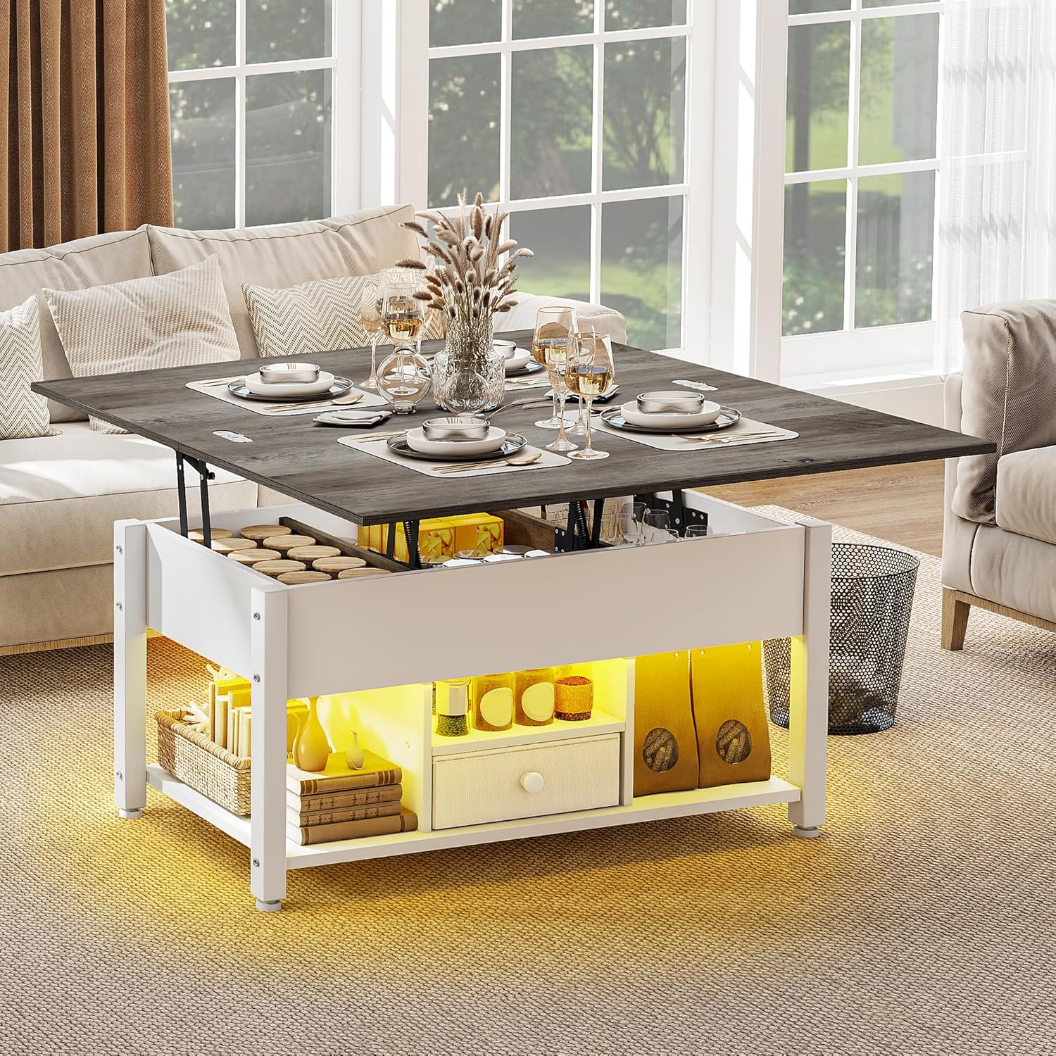 - 4-in-1 Smart Transformer: Instantly switch this lift-top coffee table into a workspace, 8-seat dining table, or gaming hub with storage; The dual gas-lift system offers stable support, while its semi-open design flexibly adapts to your surface needs