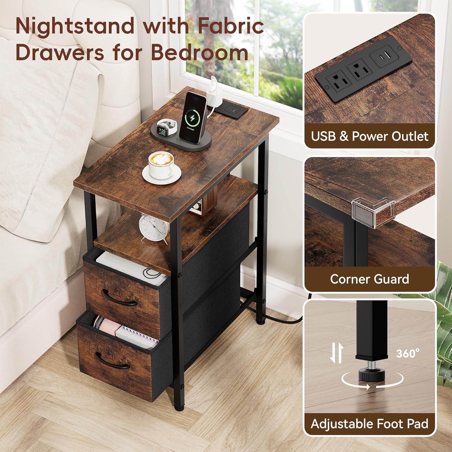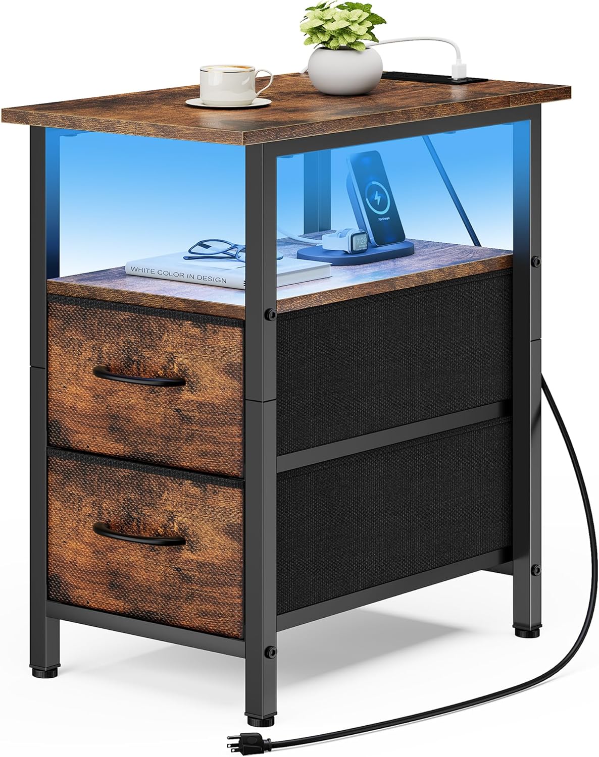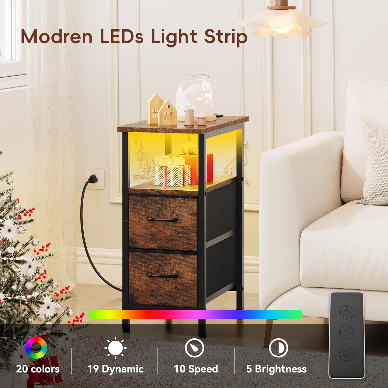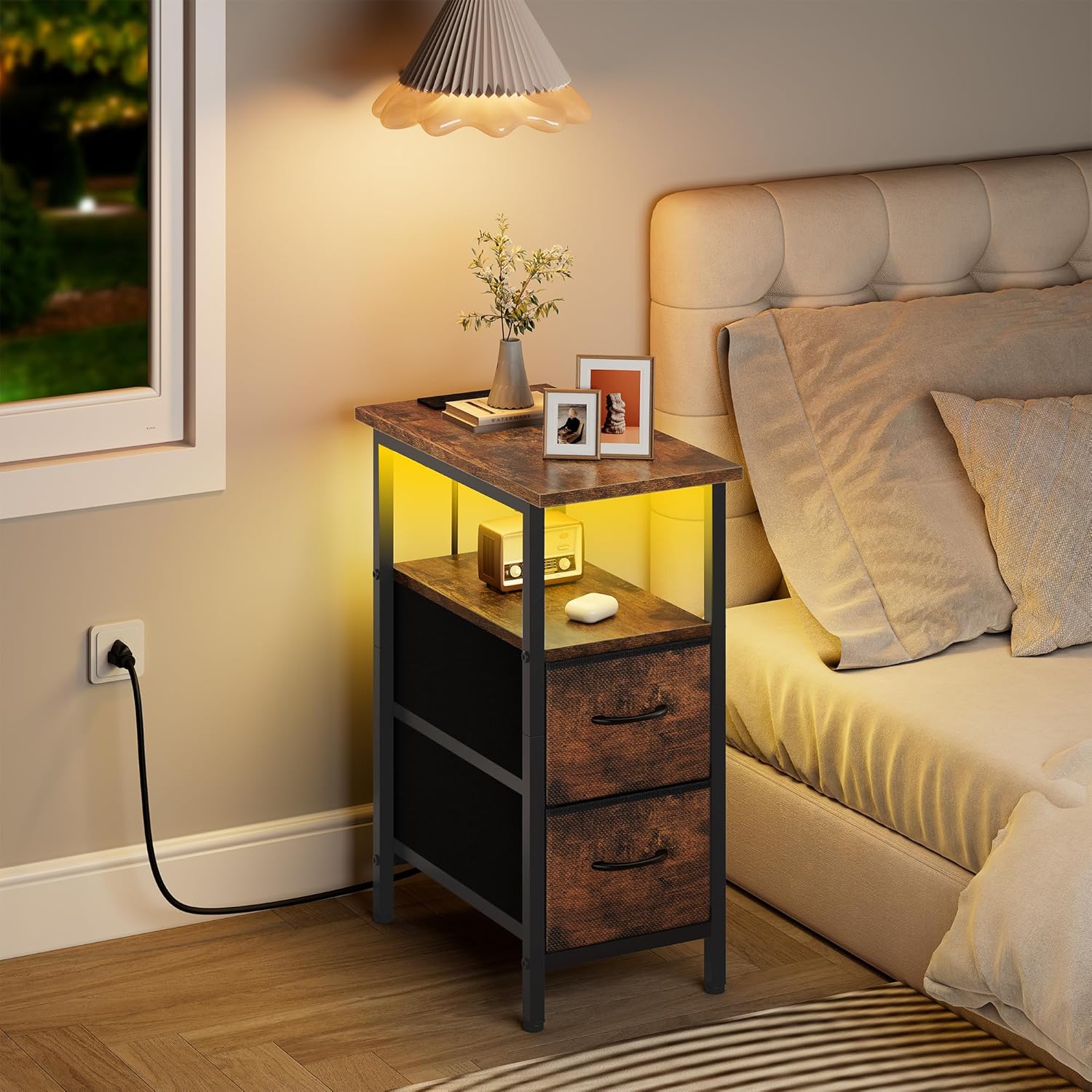 Vagusicc Nightstand with Charging Station and LED Lights, Narrow Side Table, LED Night Stand with 2 Fabric Drawers, Bedside Table with USB Ports and Outlets, Tall Nightstand for Bedroom, Rustic Brown