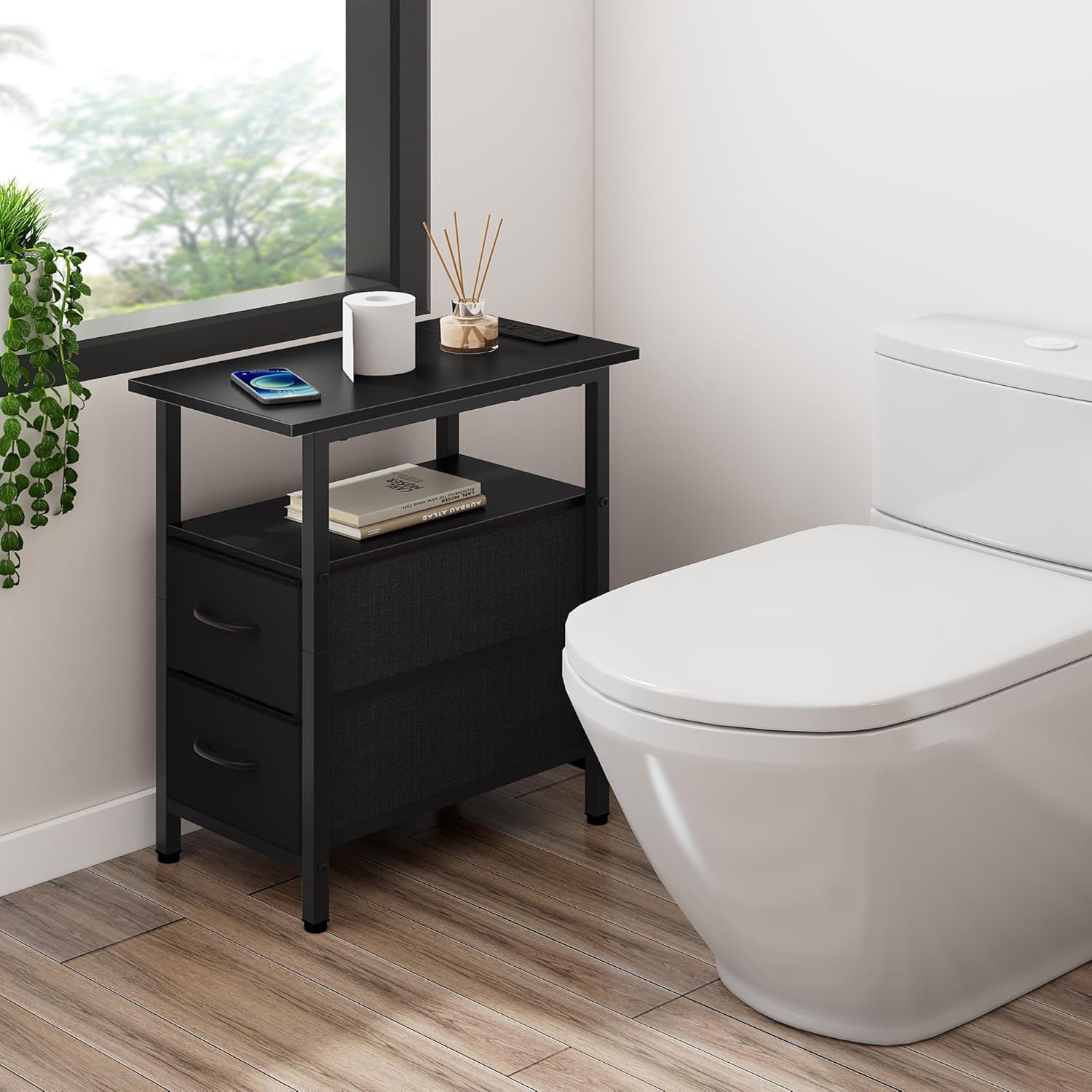 Vagusicc Black Nightstand with Charging Station and LED Lights, Narrow Side Table, LED Night Stand with 2 Fabric Drawers, Bedside Table with USB Ports and Outlets, Tall Nightstand for Bedroom, Black