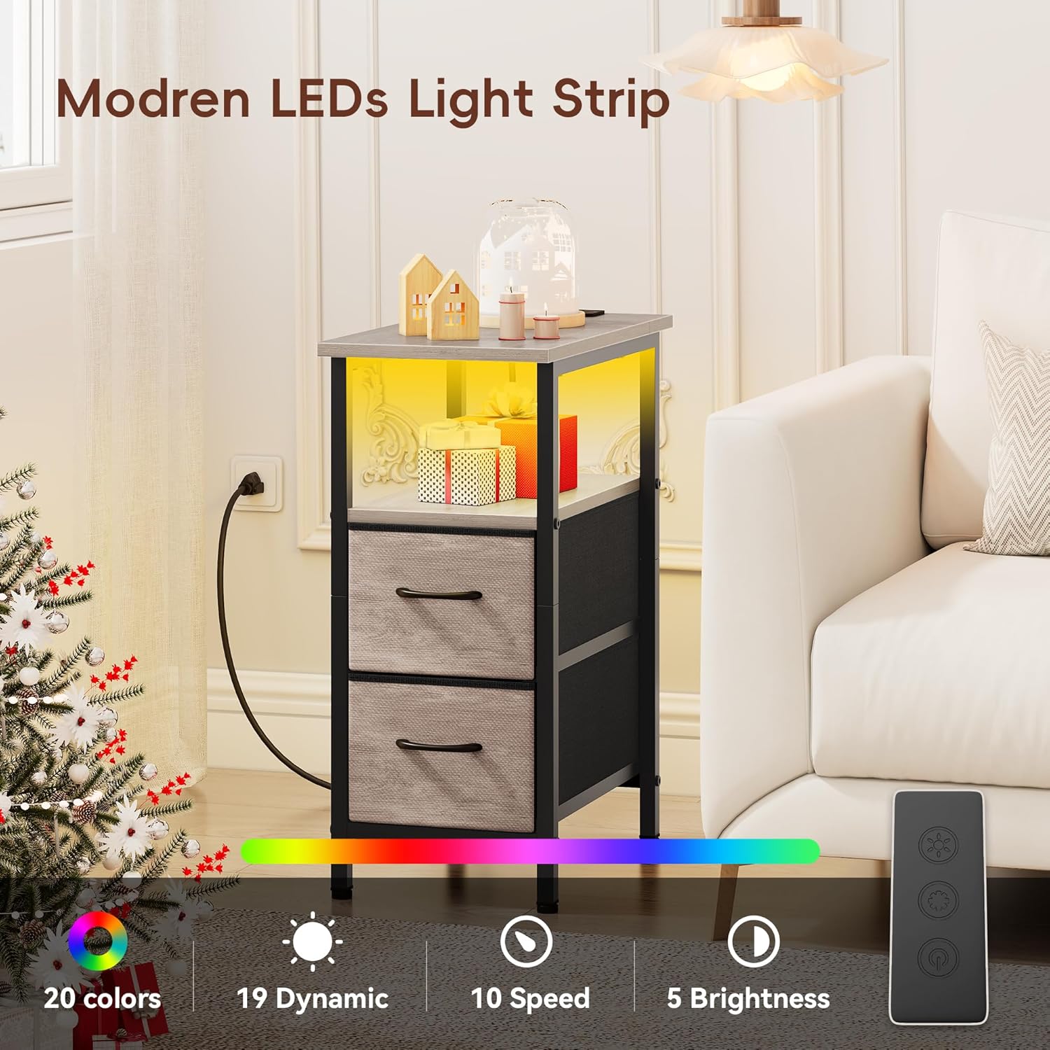 Vagusicc Nightstand with Charging Station and LED Lights, Narrow Side Table, LED Night Stand with 2 Fabric Drawers, Bedside Table with USB Ports and Outlets, Tall Nightstand for Bedroom, Rustic Grey