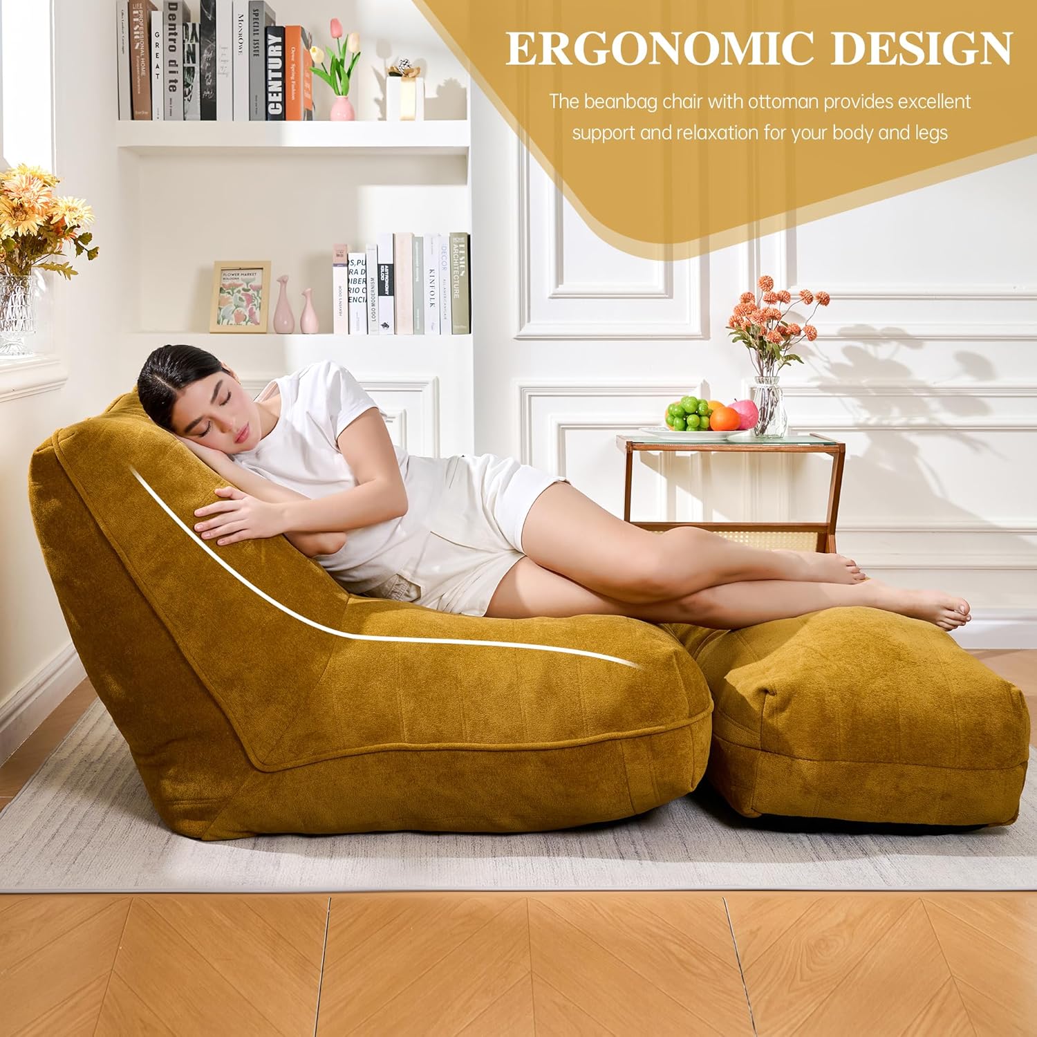 Bean Bag Chair with Ottoman, Comfy Bean Bag Sofa with Memory Foam, Lazy BeanBag Sofa with Footstool, Fireside Bean Bag Couch for Living Room, Bedroom, Apartment (Yellow)