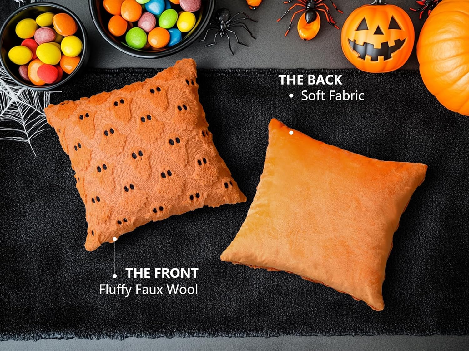 4TH Emotion Halloween Ghost Decorative Pillow Covers 18x18 Set of 2, Orange Soft Plush Faux Fur Farmhouse Throw Cushion Cases for Fall Autumn Holiday Home Decorations