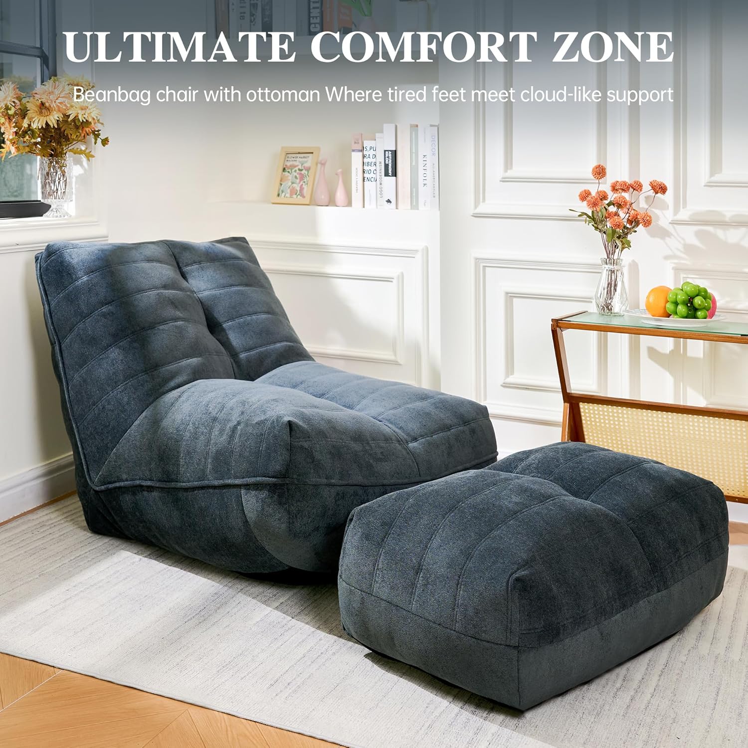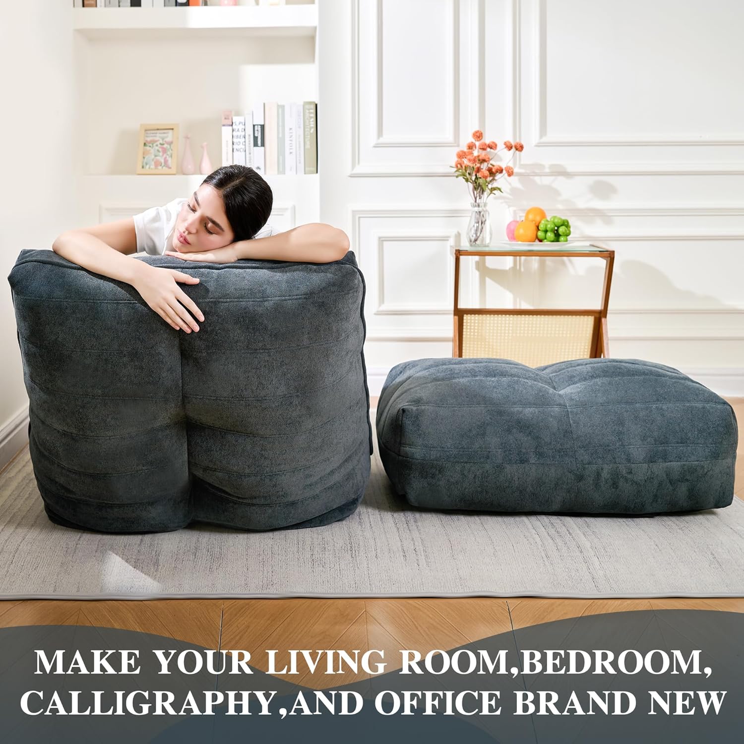 Bean Bag Chair with Ottoman, Comfy Bean Bag Sofa with Memory Foam, Lazy BeanBag Sofa with Footstool, Fireside Bean Bag Couch for Living Room, Bedroom, Apartment (Blue Gray)