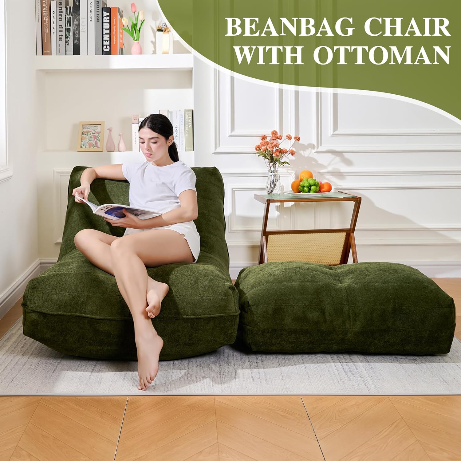 Bean Bag Chair with Ottoman, Comfy Bean Bag Sofa with Memory Foam, Lazy BeanBag Sofa with Footstool, Fireside Bean Bag Couch for Living Room, Bedroom, Apartment (Green)