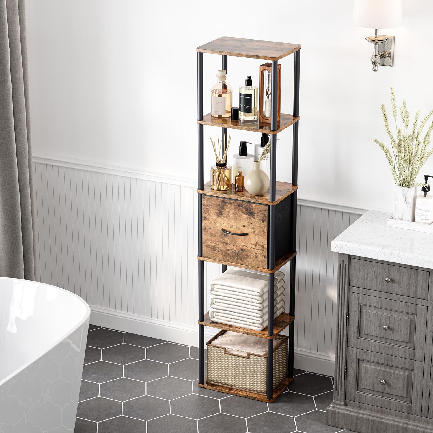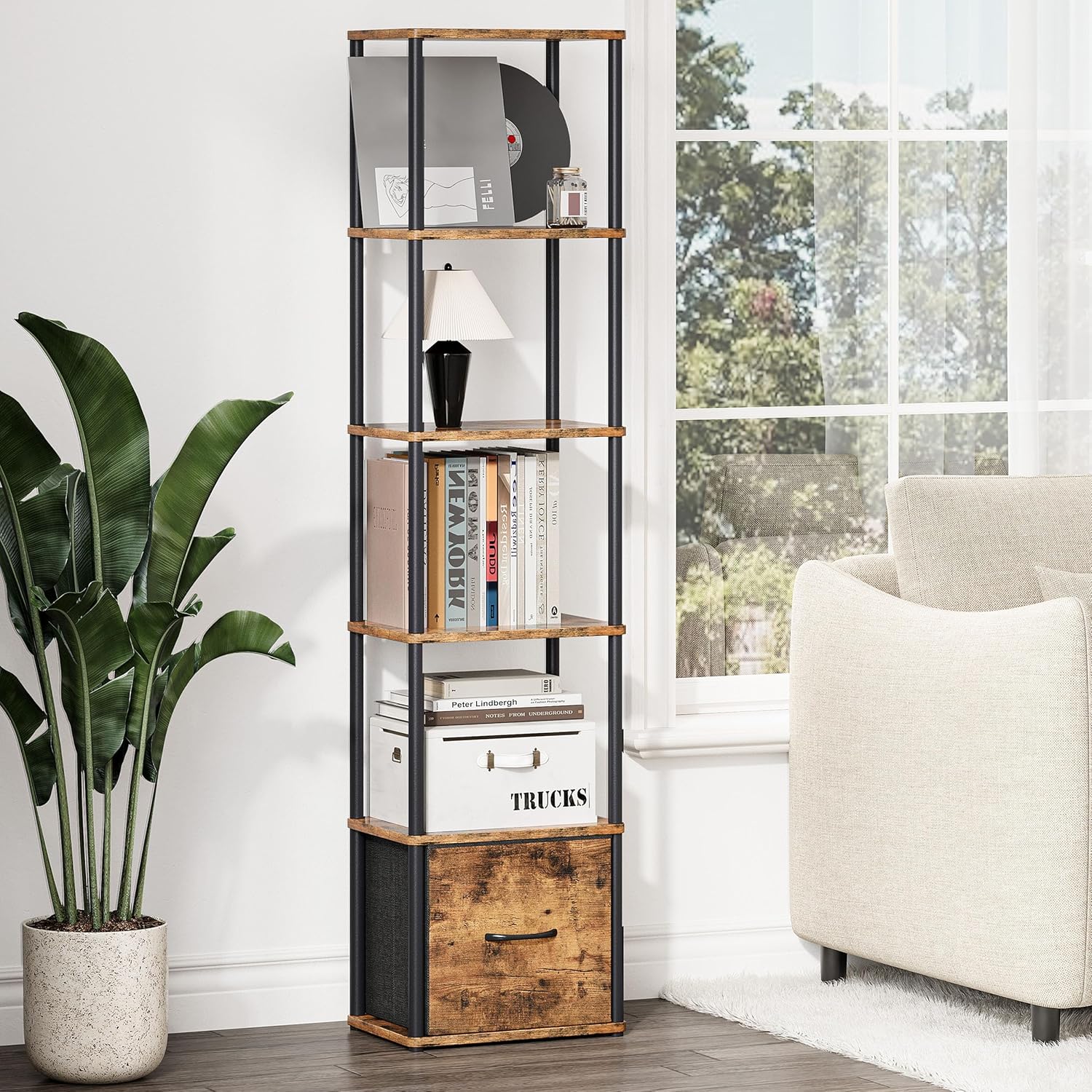 6-Tier Bookshelf with Drawer,Narrow Bookshelves Organizer,Floor Standing Ladder Shelf,Tall Bookcase for Small Space,Book shelf with Storage for Living Room, Bedroom, Office, Study Rustic Brown HBC505R