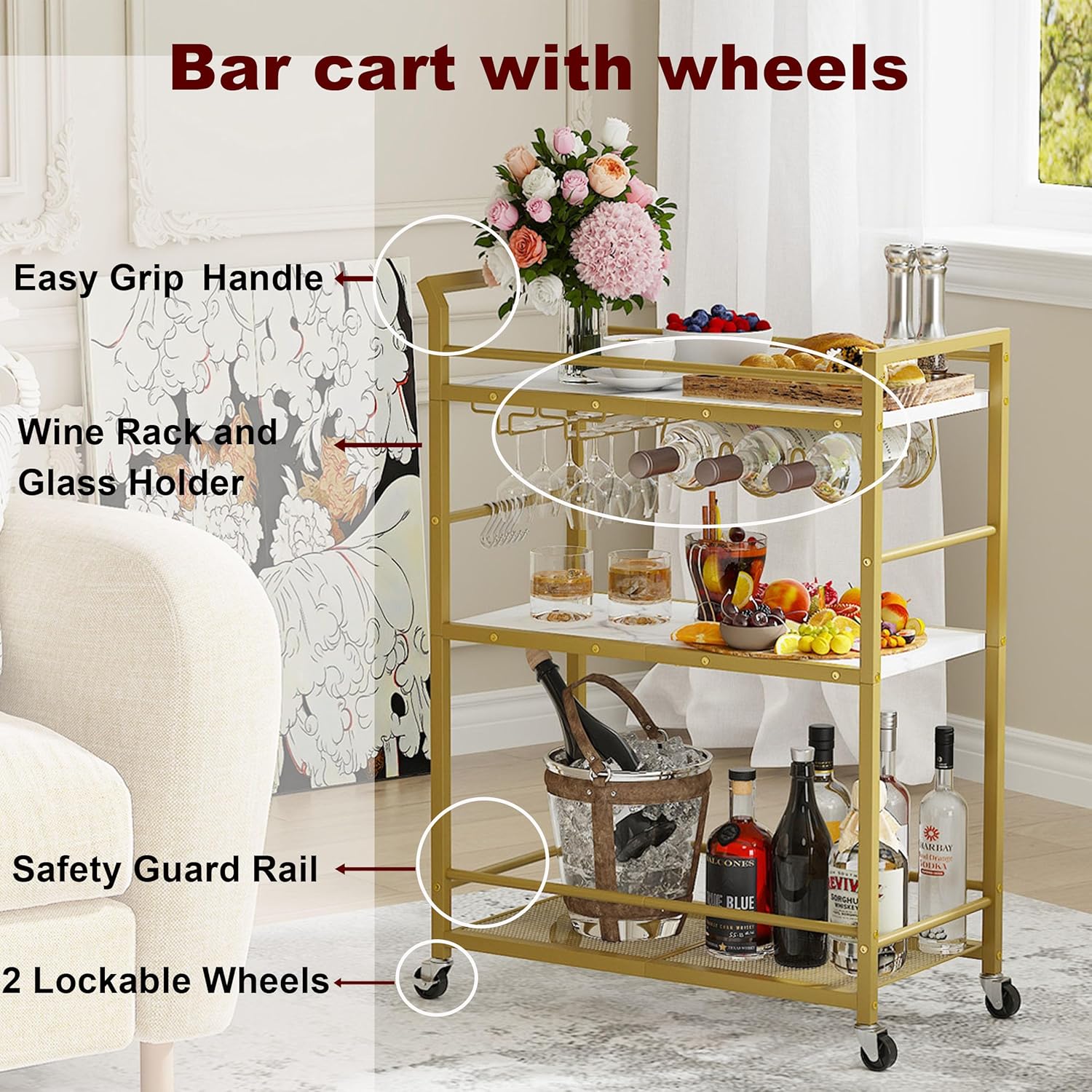 3 Tier Bar Cart, Home Bar Serving Cart with Wheels, Small Rolling Beverage Cart with Glass Holders, Mini Drink Cart with Wine Rack for Kitchen Dining Living Room Gold GBC507G