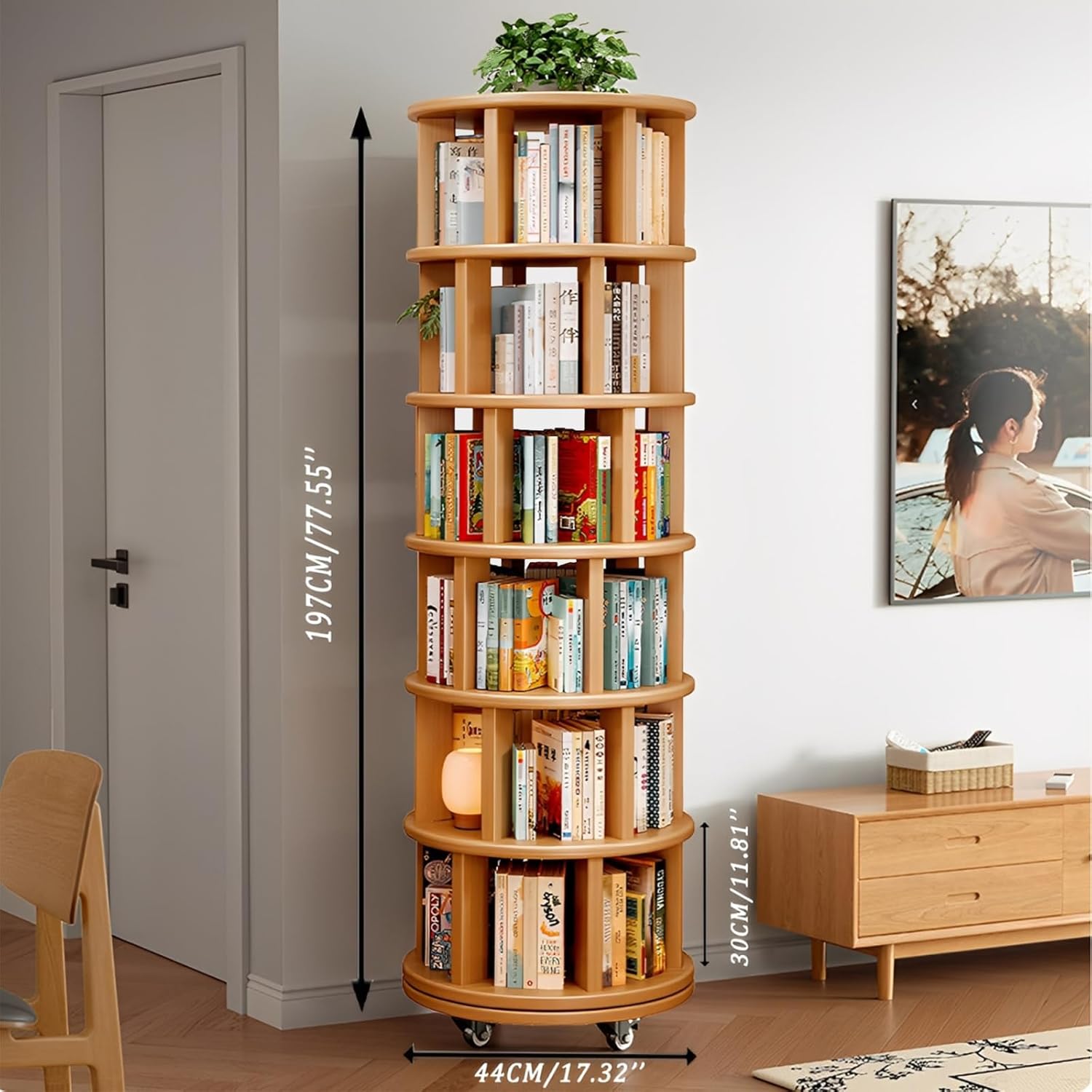 Wood Rotating Bookshelf on Wheels, 360-Degree Space Saving Bookcase, Large Capacity Spinning Bookshelf Tower for Living Room,Bedroom and Corners (Nature-6 Layers)