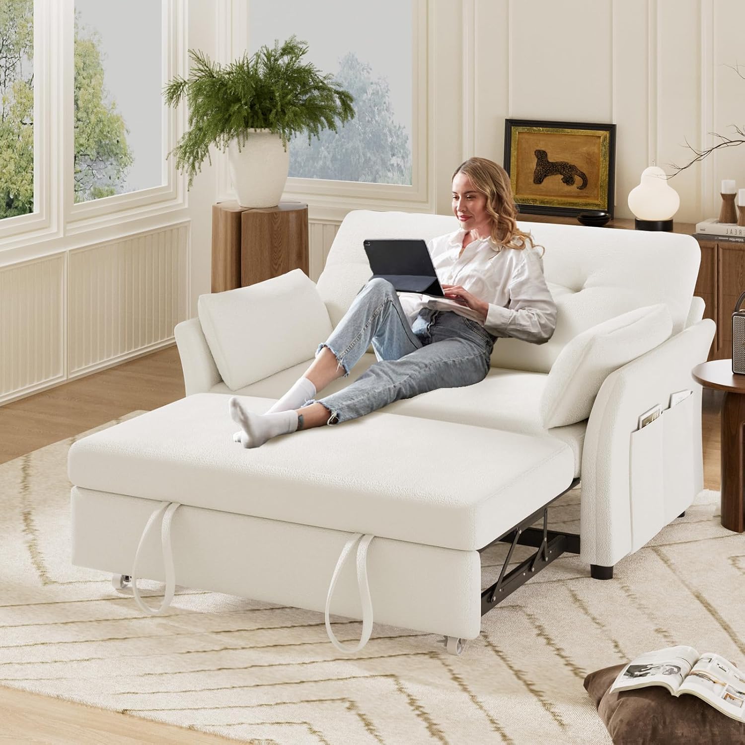 Vipbear 3-in-1 Chenille Convertible Sofa Bed, Pull Out Sleeper Sofa with Reclining Backrest & Side Pocket, Tool-Free Assembly, Folding Loveseat for Living Room, Apartment, White