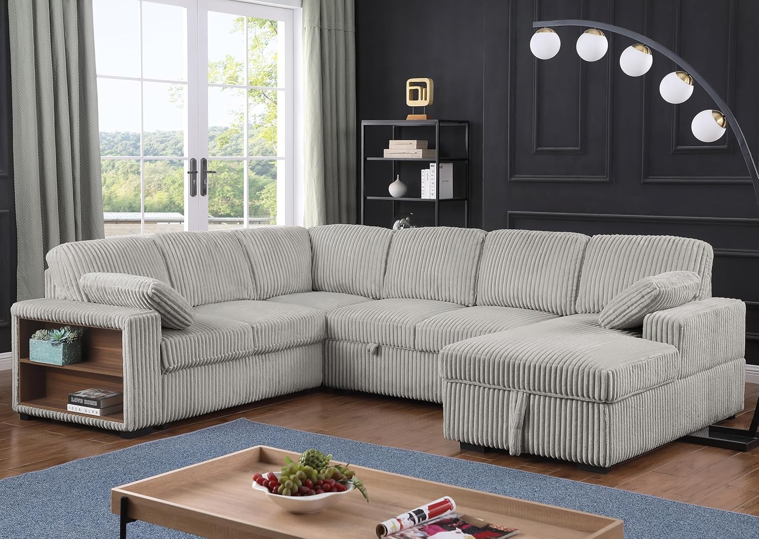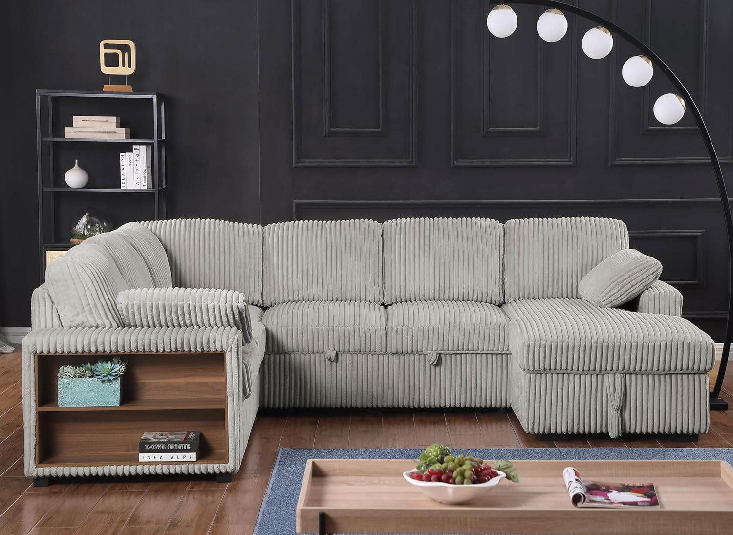 Eafurn Oversized U Shaped Convertible Sleeper Sectional Sofa w/Pull Out Couch Bed, 6 Seater Corduroy Upholstered Corner Lounge Sofa Couch Sleeper Sofabed w/Storage Chaise,Shelves