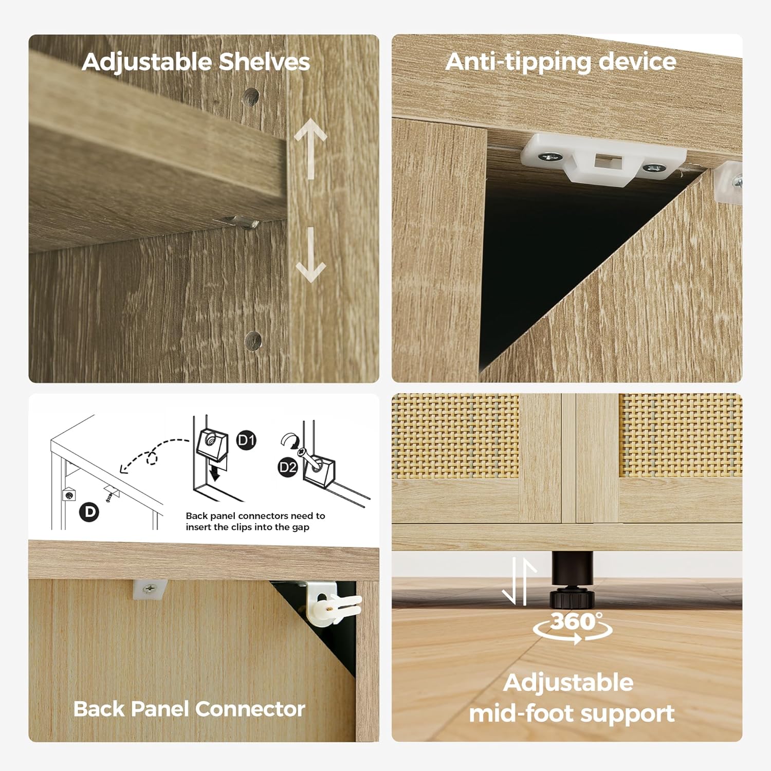 - 【Bohemian design】 This credenza storage cabinet is equipped with 4 design rattan wood doors, kitchen sideboard with black metal handles, adding a unique sense of fashion and charm to the product. The spacious top countertop can be used as a cooking table or to store tableware, etc., keeping the kitchen clean and tidy.
