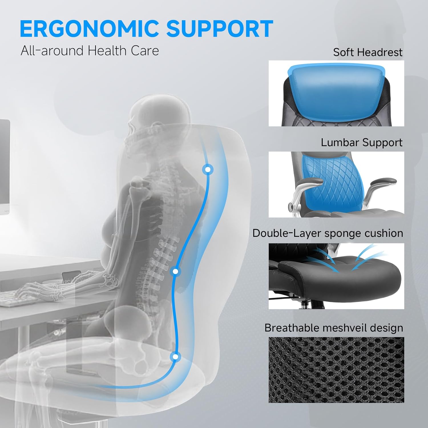 COMHOMA Big and Tall Office Chair, High Back Leather Executive Chair with Pocket Spring Lumbar Support and Flip-up Armrests, Swivel Managerial Office Chair with Adjustable Height, Black