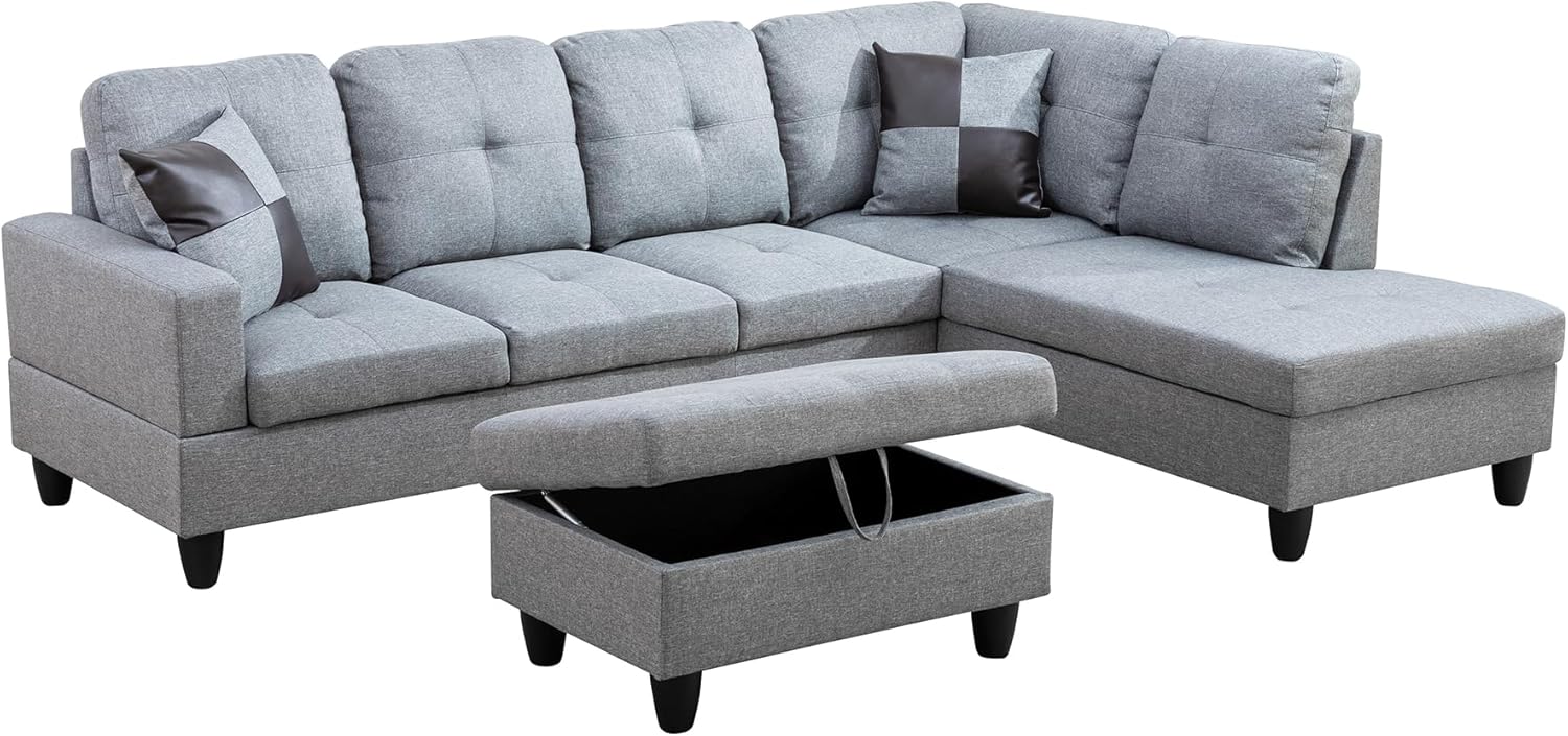 Couches for Living Room Modern L Shaped Couch Comfy Linen Fabric 3 Pieces Sectional Sofa with Chaise, Ottoman with Storage for Office and Small Apartment, Grey