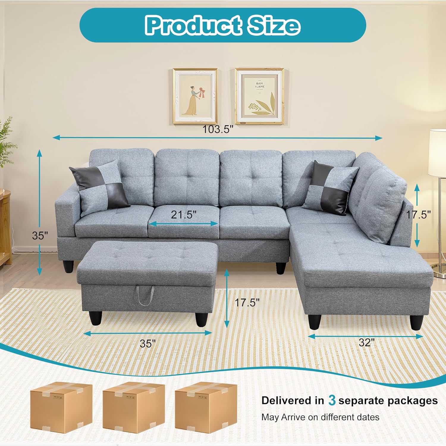 - Versatile and Practical Design: The chaise lounge setup allows for flexibility in your seating arrangement, enabling you to adjust the sofa to fit your space. The included storage ottoman adds functionality, offering a handy way to keep your living area neat and orderly.