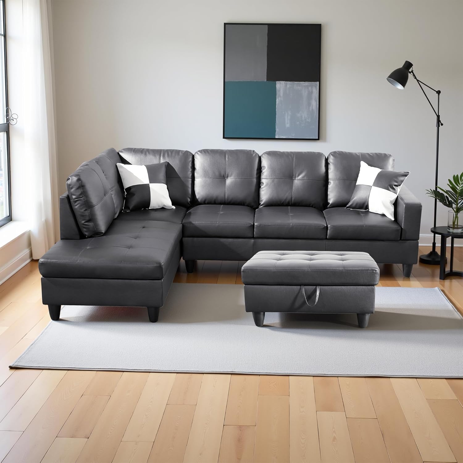 L Shaped Couch Faux Leather Sectional Couch Upholstered 3 Pieces Sofas for Living Room with Chaise, Storage Ottoman for Office and Small Apartment, Black