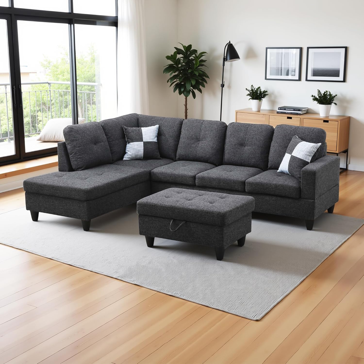 L Shaped Couch Modern Sectional Couch Upholstered Flannel Fabric 3 Pieces Sofas for Living Room with Chaise, Storage Ottoman for Office and Small Apartment, Black Grey