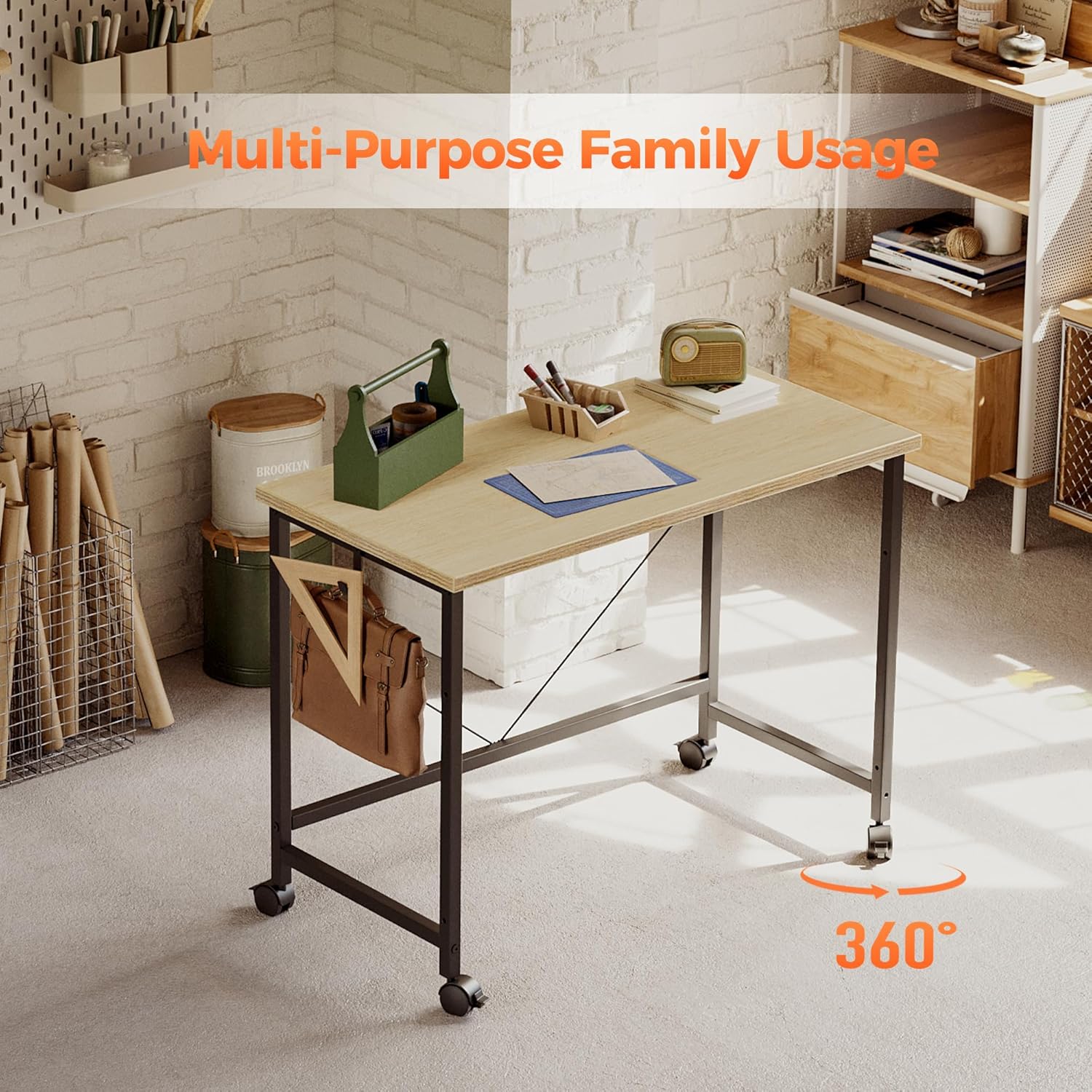 - 【Space-Saving Design】The sleek wood surface and steel frame of this desk with wheels complement any décor. This compact rolling desk maximizes your available space while providing ample work surface for all your needs.