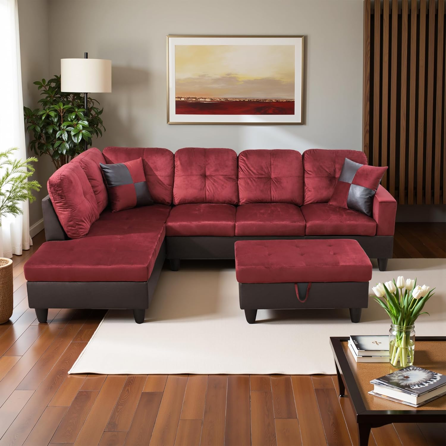 L Shaped Couch Modern Sectional Couch Upholstered Flannel Fabric 3 Pieces Sofas for Living Room with Chaise, Storage Ottoman for Office and Small Apartment, Red