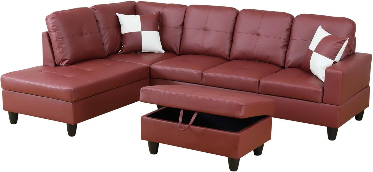 L Shaped Couch Faux Leather Sectional Couch Upholstered 3 Pieces Sofas for Living Room with Chaise, Storage Ottoman for Office and Small Apartment, Dark Red