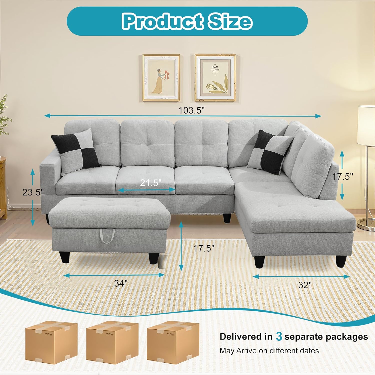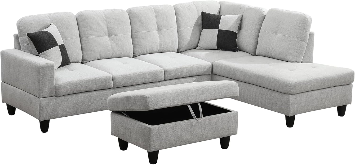 - Versatile and Practical Design: The chaise lounge setup allows for flexibility in your seating arrangement, enabling you to adjust the sofa to fit your space. The included storage ottoman adds functionality, offering a handy way to keep your living area neat and orderly.