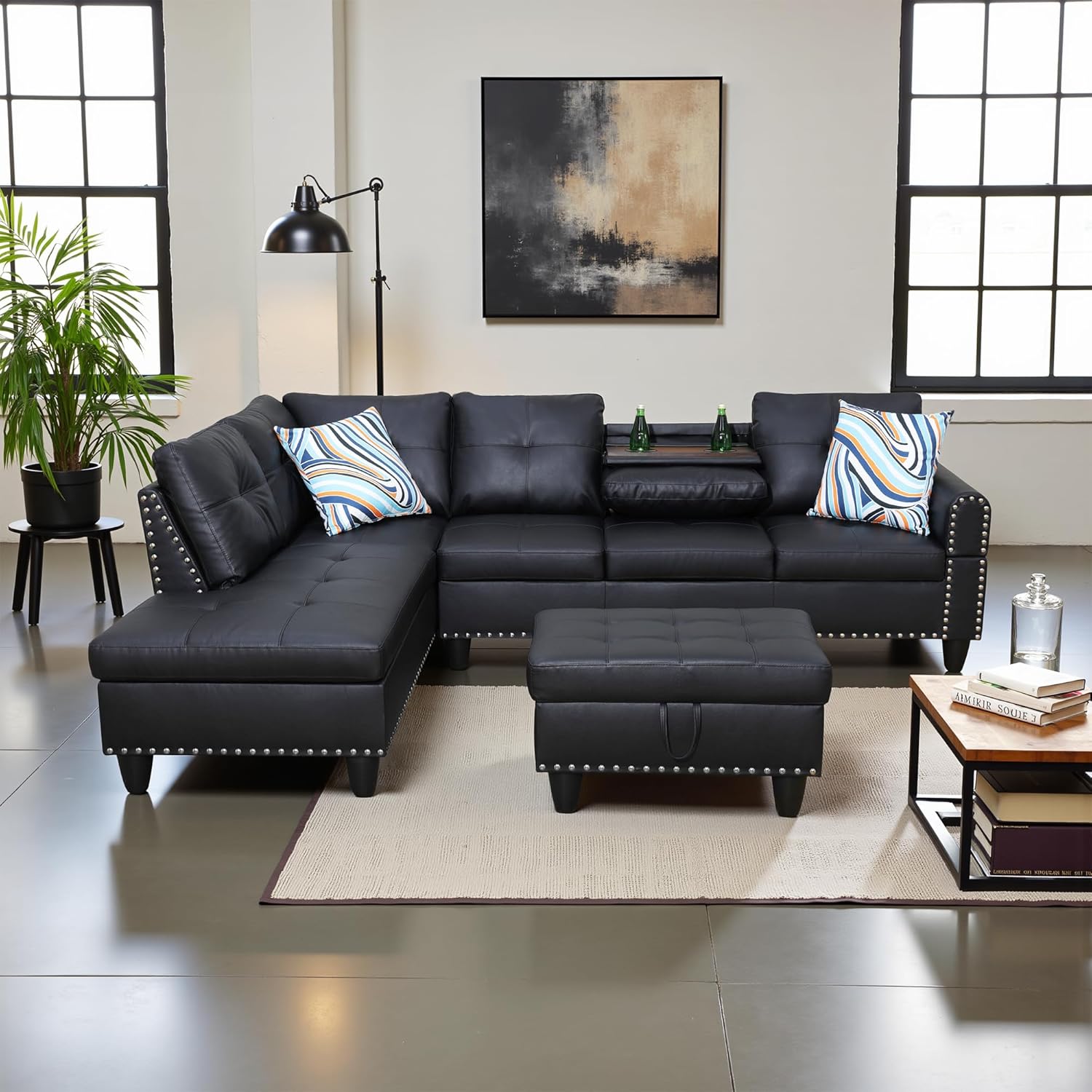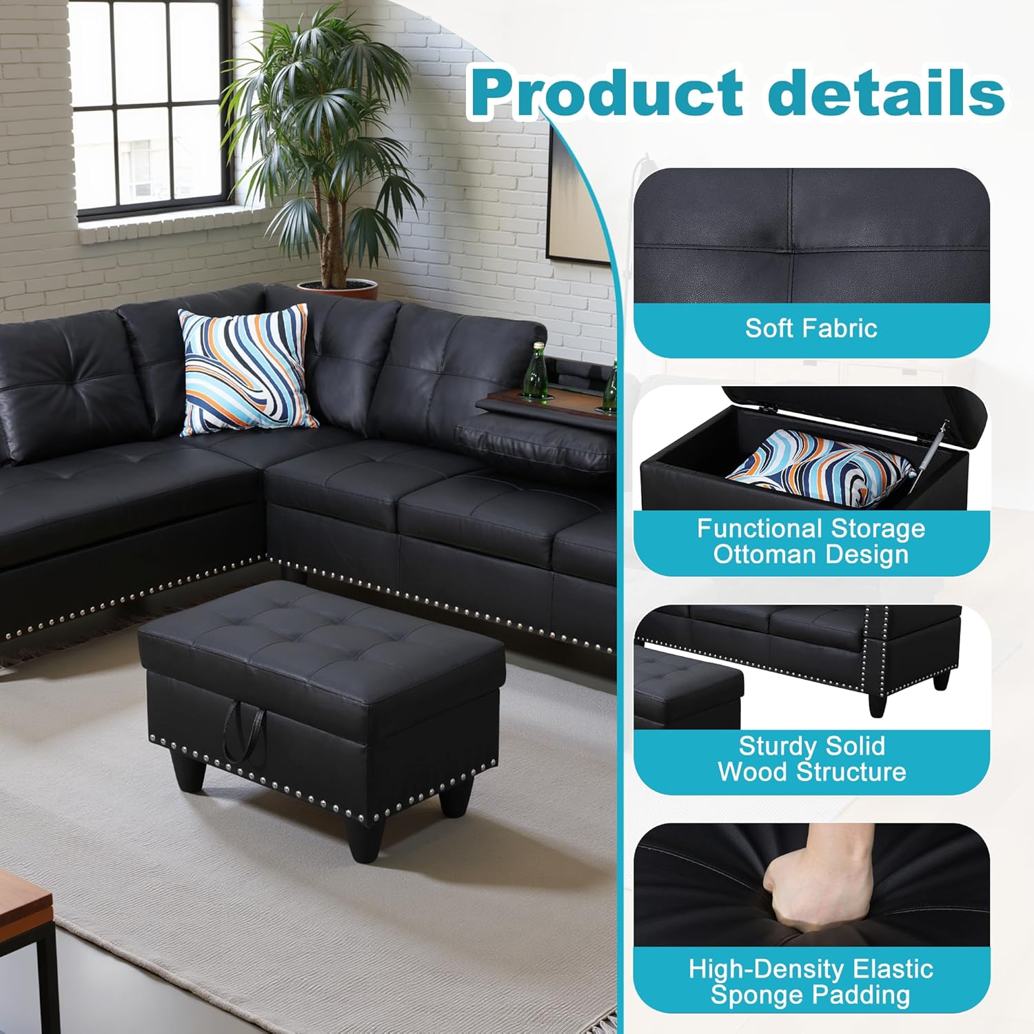 L Shaped Couch Faux Leather Sectional Couch Upholstered 3 Pieces Sofas for Living Room with Chaise, Storage Ottoman for Office and Small Apartment, Graceful Black